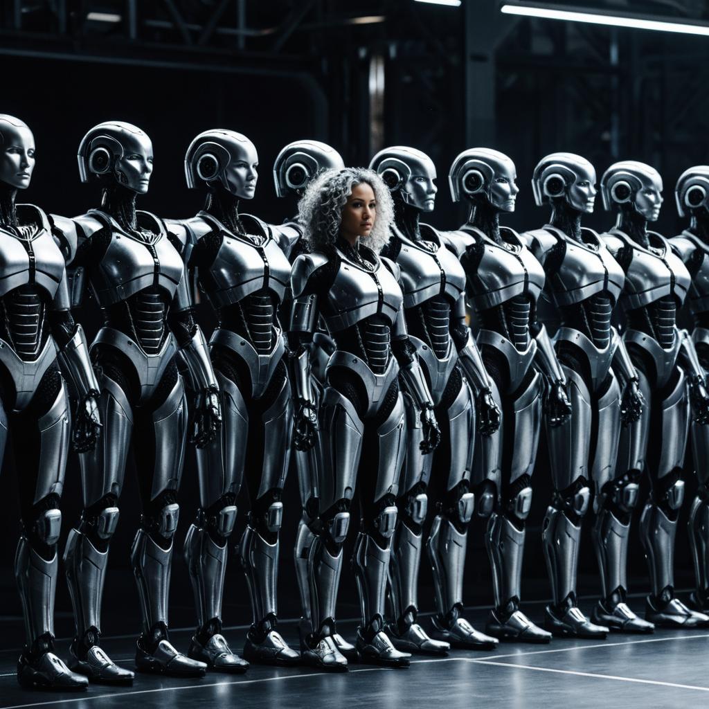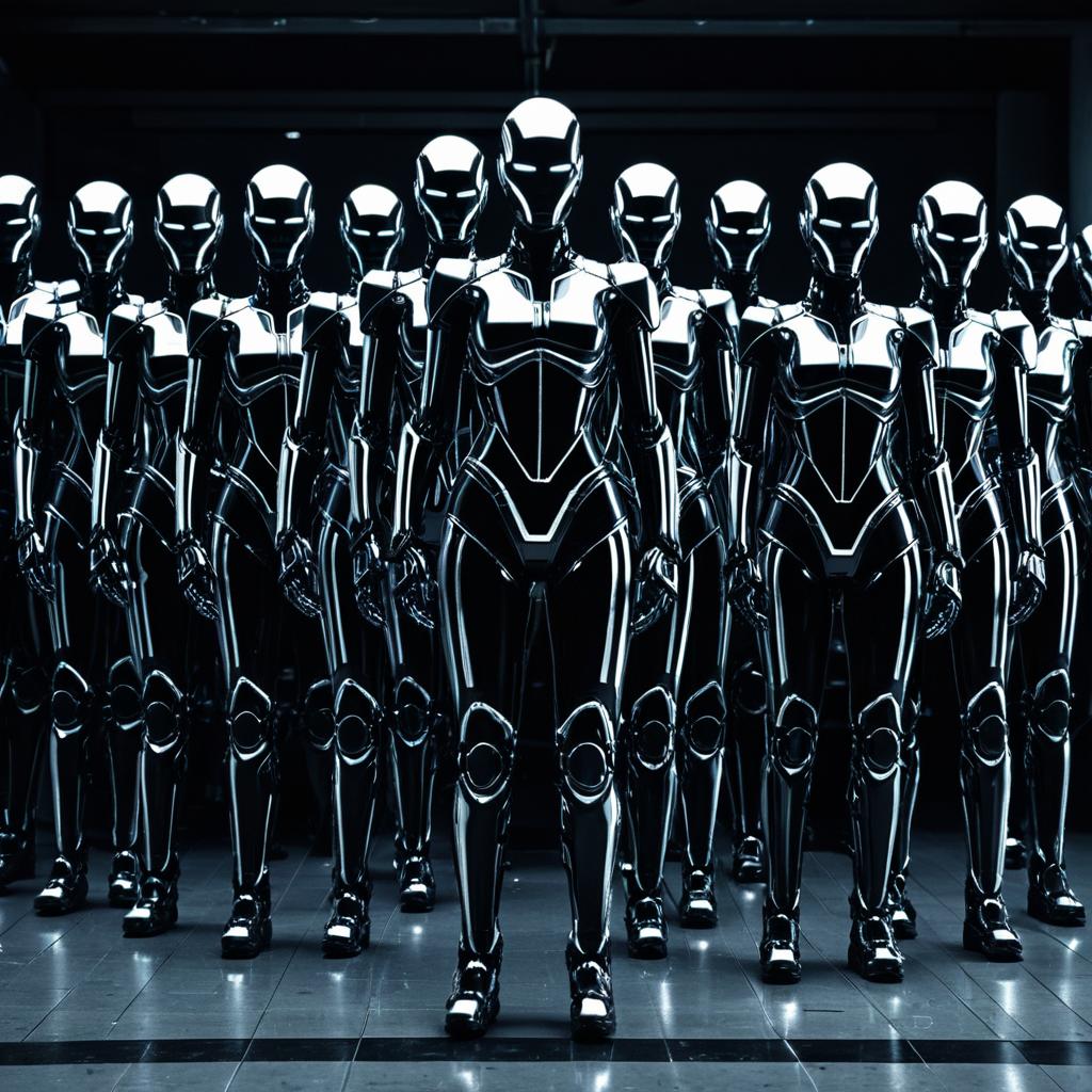 3D rendering of multiple rows of black humanoid androids with lifelike features, each with short red hair. The androids stand in a uniform formation in an industrial setting. The image highlights intricate mechanical details combined with human-like facial characteristics, with strong directional lighting emphasizing shadows and textures for a cinematic and high-contrast effect.