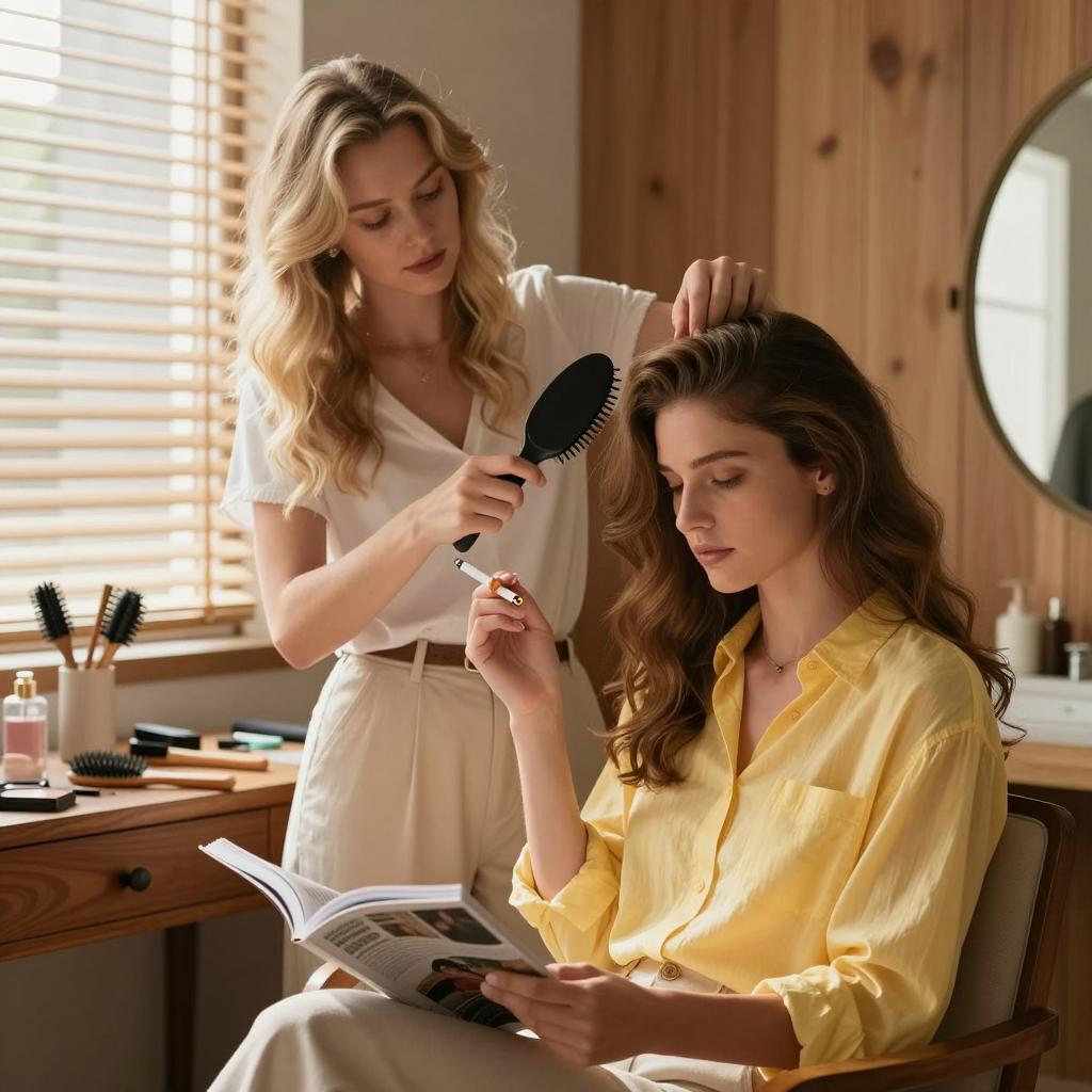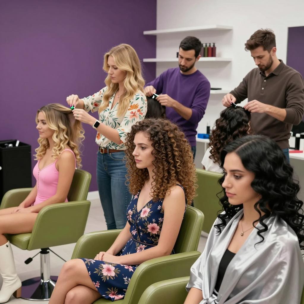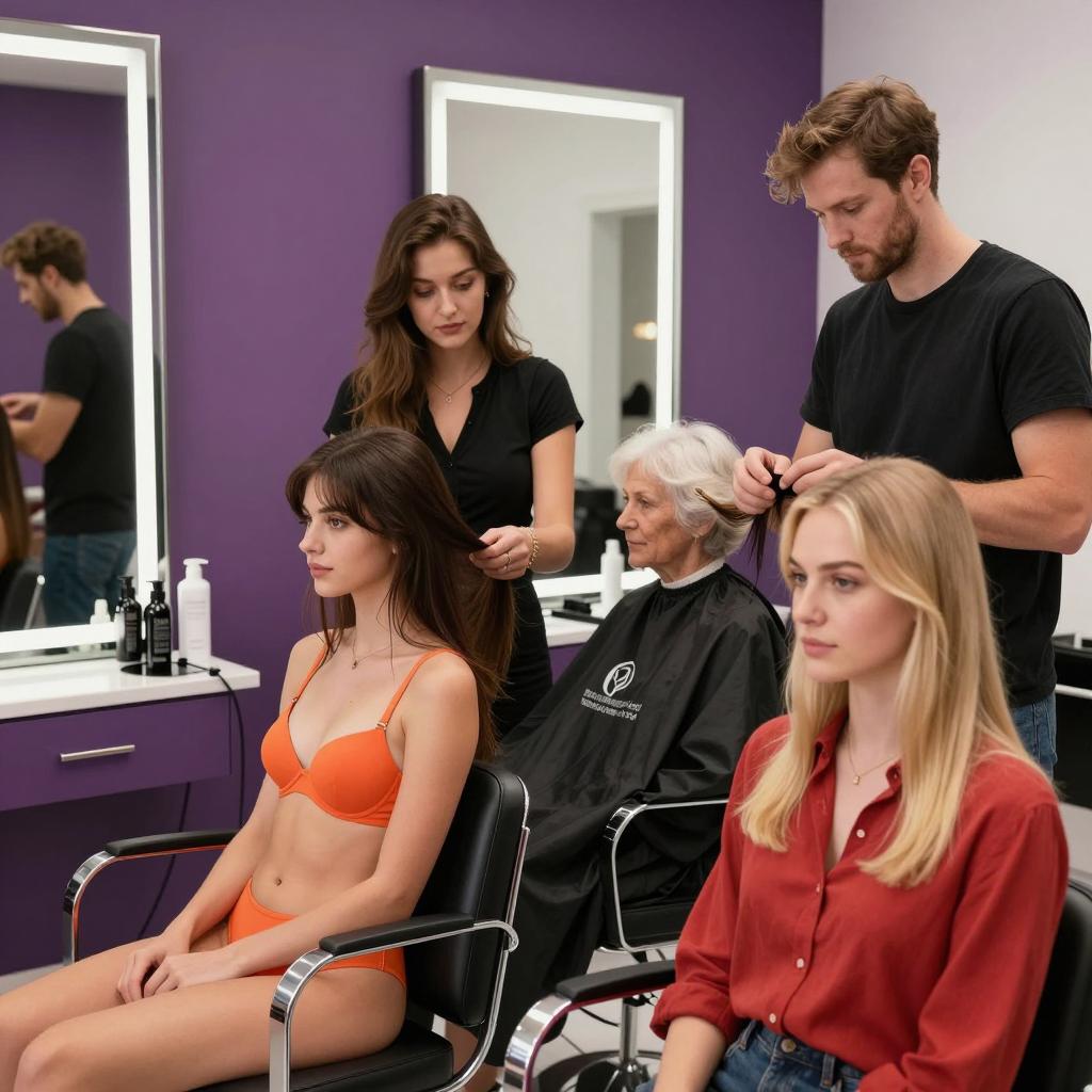 Five people in a hair salon. Dark-haired woman in orange bra and underwear, sitting, receiving hair touch-up. Blonde woman in red top, sitting, receiving hair touch-up. Older woman with white hair, styling another woman's hair. Young woman with brown hair, standing, looking at blonde woman. Man with brown hair, adjusting blonde woman's hair. Purple walls, mirrors, hairdressing equipment.