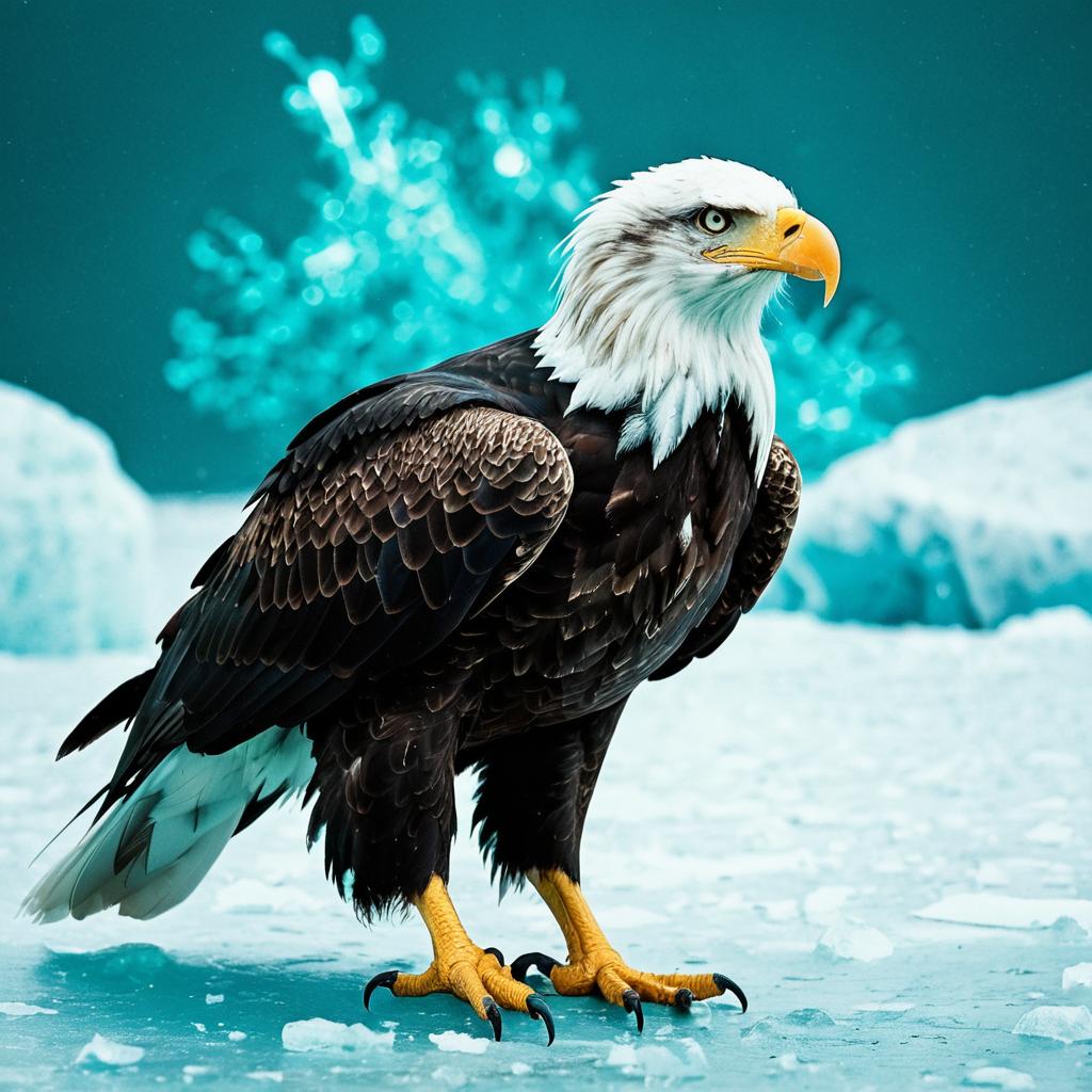 Radiant isotope, a bald eagle's essence distilled into its purest radioactive form, its glowing body a study in the beauty of atomic particles, luminous icy teal, delicate crystalline structures