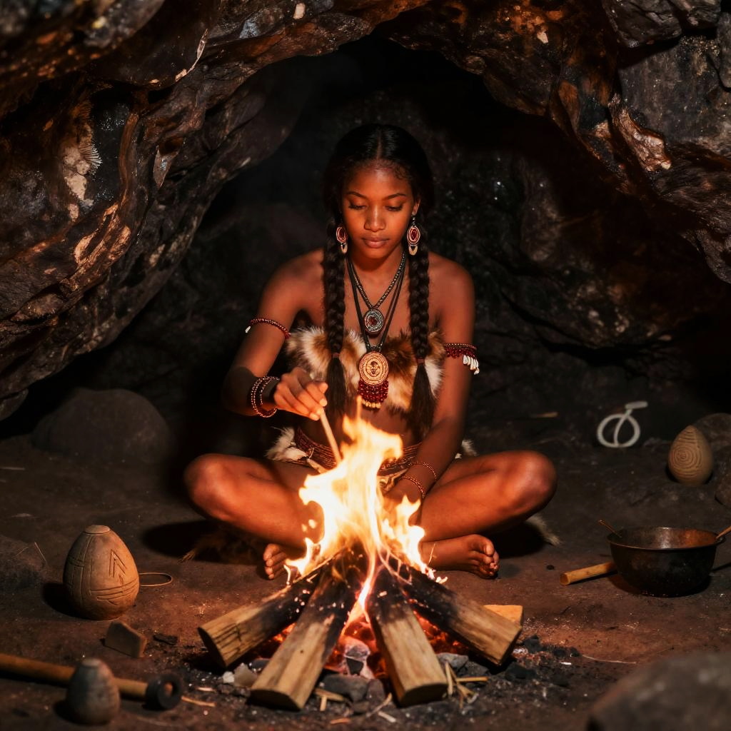 A photograph of a young woman with dark skin and long braided hair, sitting cross-legged in front of a small, bright fire inside a dark, rocky cave. She's wearing traditional tribal jewelry and a fur-edged top, focused on a handheld tool. The cave's rough texture contrasts with the warm, glowing fire. Small, carved stone objects and cooking utensils are scattered around the fire.
