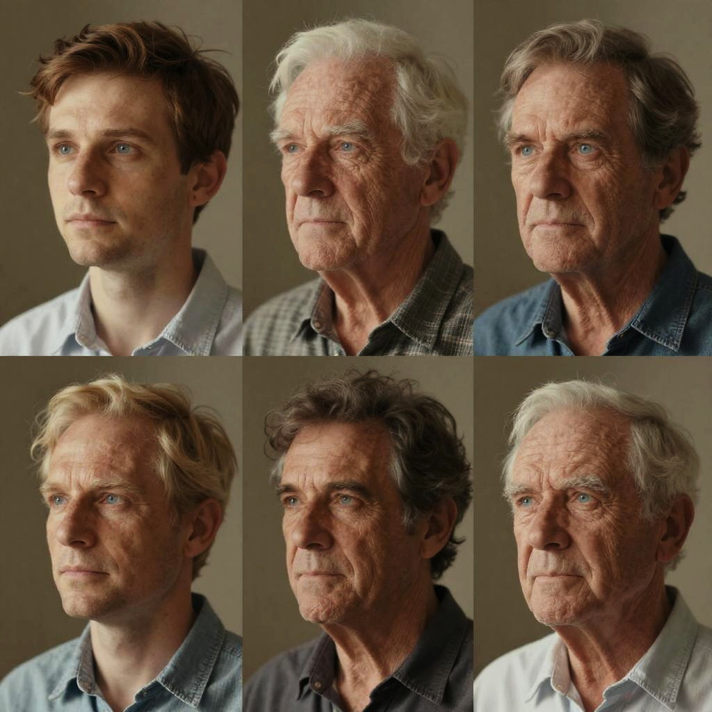 Artistic age generator photo sequence of a man aging from youth to old age, emphasizing textured skin, changes in hair color and style, and the deepening of facial lines, with a warm-toned color palette and cinematic lighting.