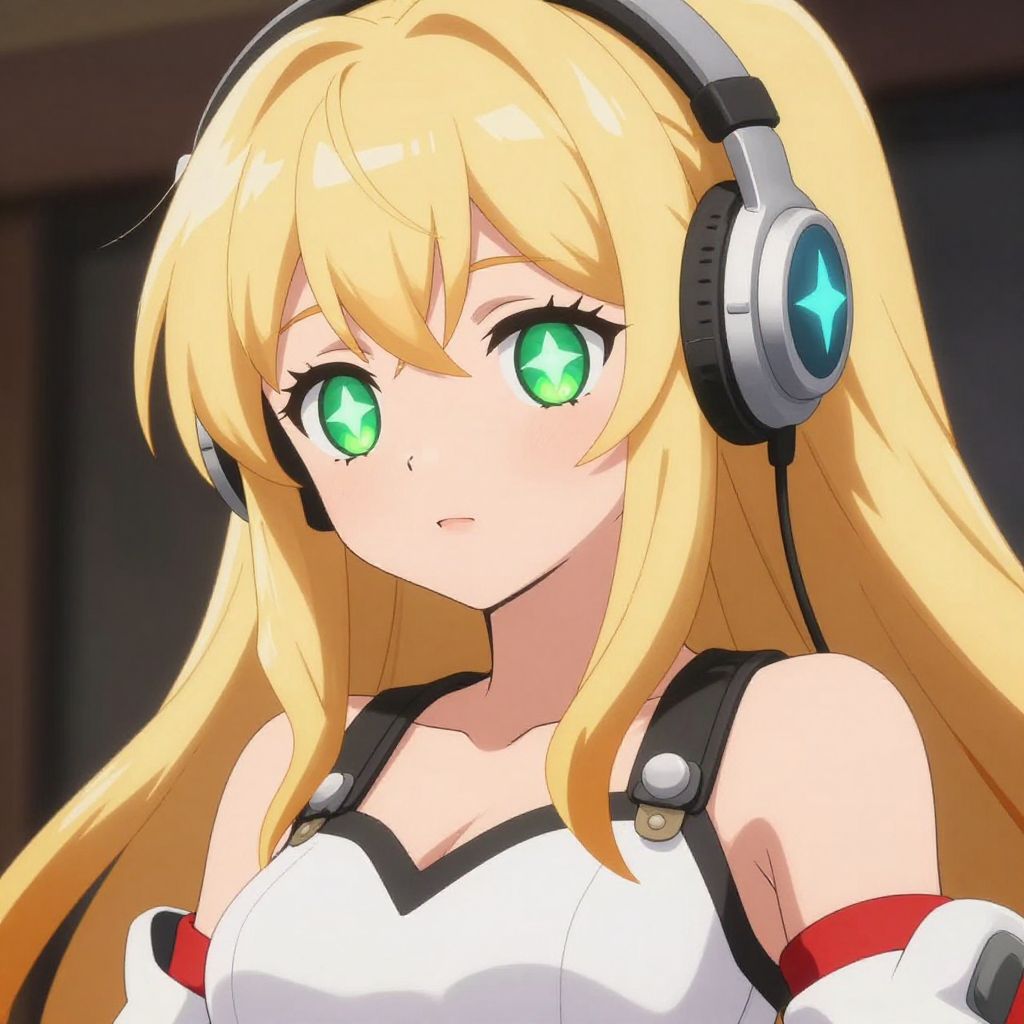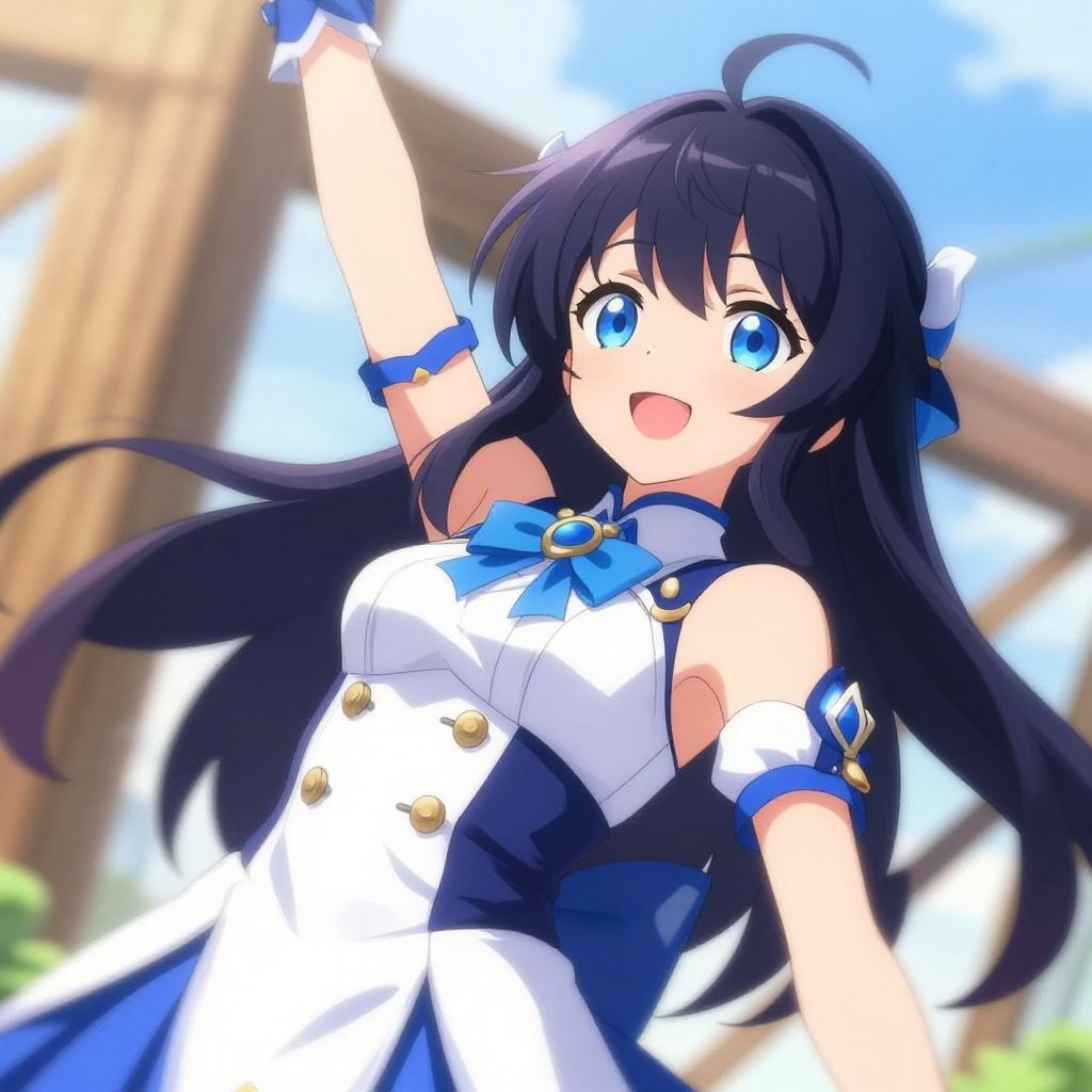 Digital anime-style drawing of a blue-haired girl with yellow horns, yellow eyes, and a yellow top, smiling with arms raised, surrounded by blue energy