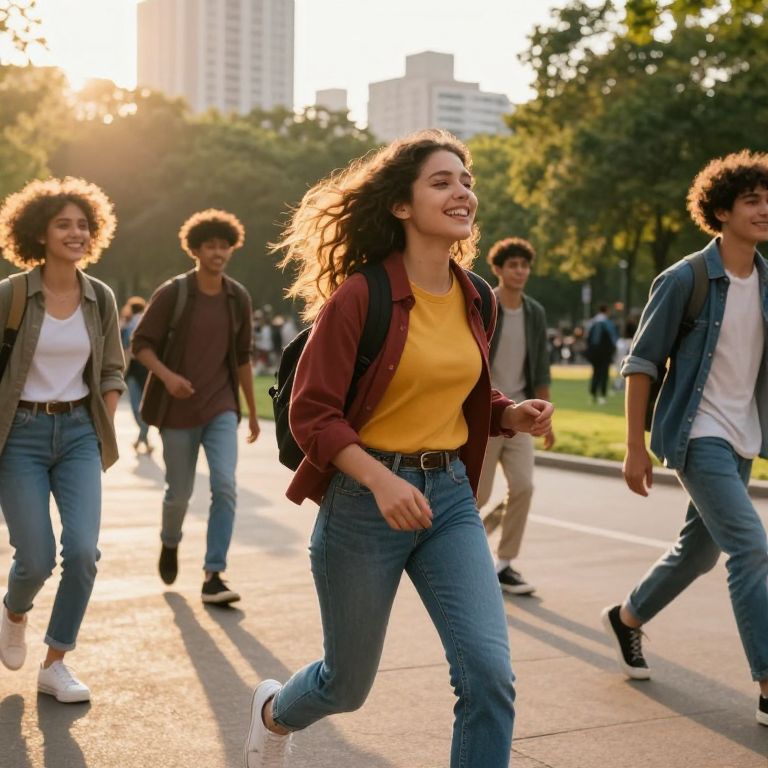 Youth embracing the golden hour sunlight in a lively urban park, vibrant colors, joyful expressions, dynamic movement, warm tones, capturing the essence of freedom and energy, detailed natural background, cinematic style.
