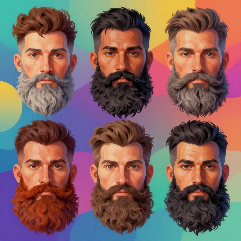 Digital illustration of six bearded men with different beard styles and colors on a colorful, abstract background. Each man has unique facial features and hairstyles.
