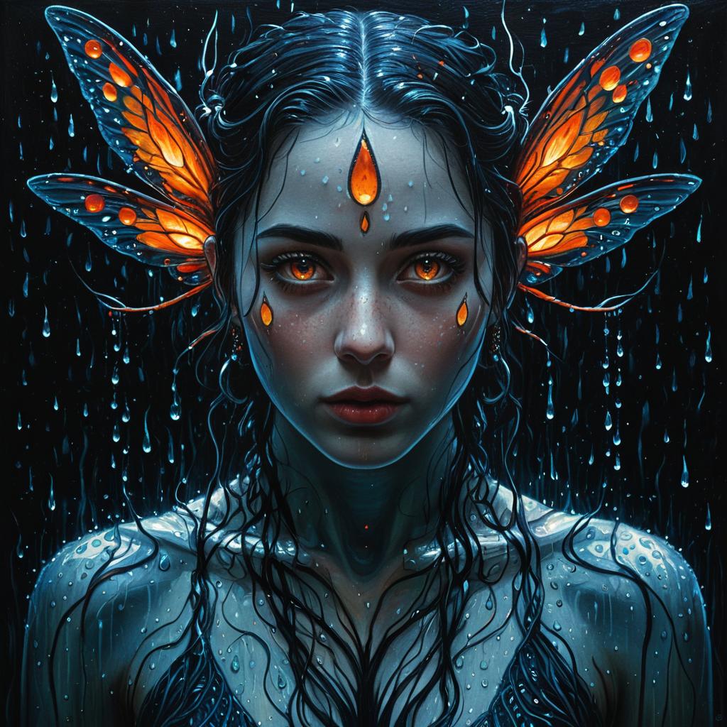 Beautiful hybrid cyborg with chromatic digital tattoos pulsating across limbs, oil painting, detailed fiery eyes, ethereal glow, dark and mysterious, high quality, vibrant colors, surreal, haunting, intricate floral details, intense gaze, mystical atmosphere