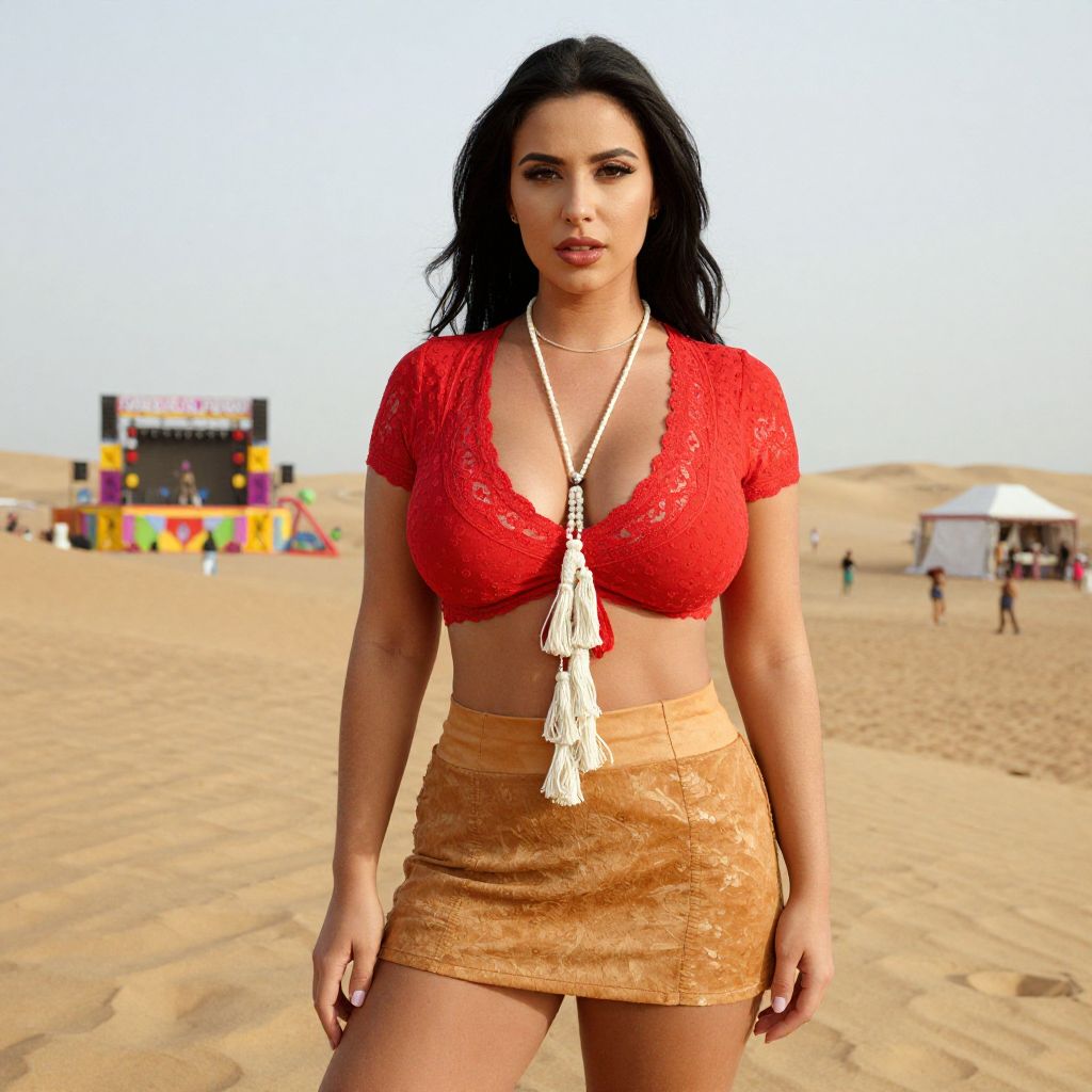 A Curvy woman in a crimson blouse with lace detailing and a caramel suede mini skirt, accessorized with a long white tassel necklace, standing in a desert dune with a vibrant desert festival in the background. Visual style: Chromogenic film. Sexy. Pretty face and beаutiful eyes. Big breasts.