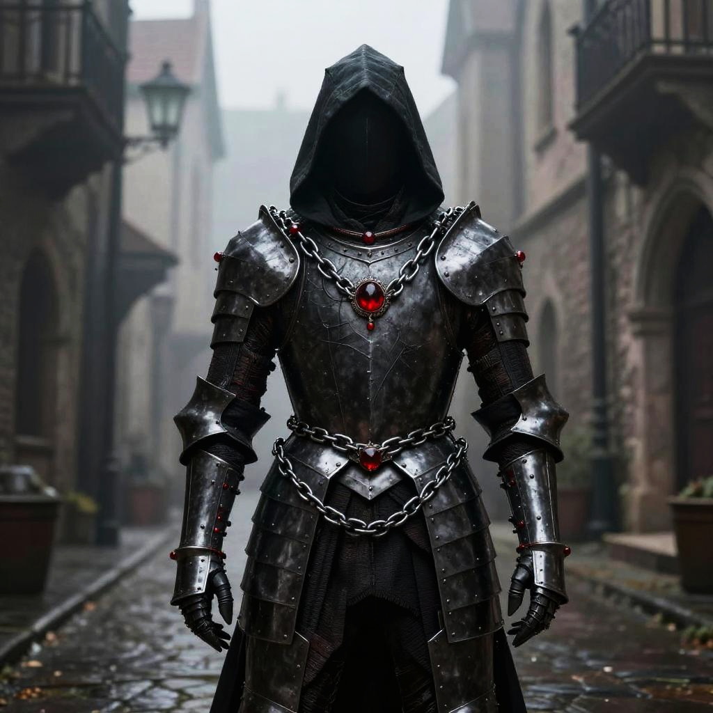 Dnd chain armor with a mysterious dark aura, blackened steel interlaced with crimson gems, worn by a shadowy rogue character in a foggy alley of a medieval city