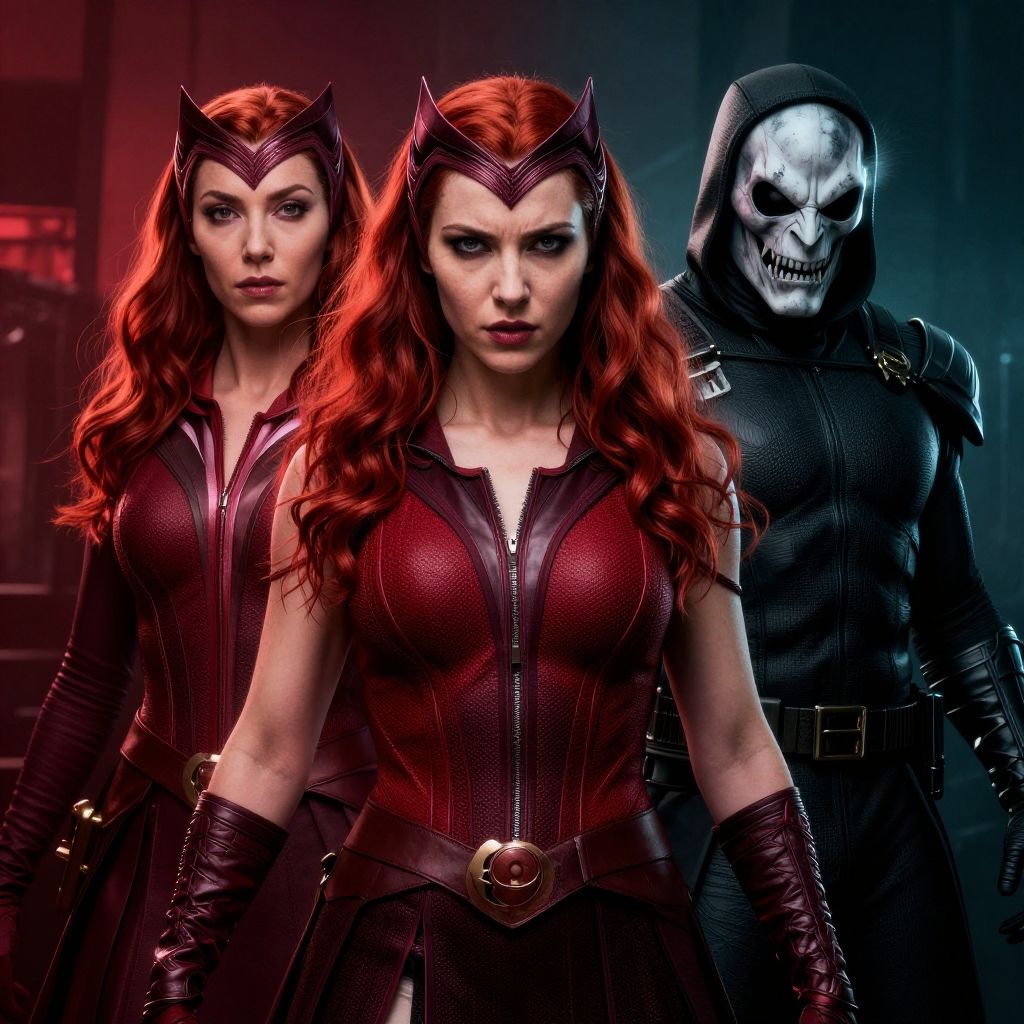 This is a digitally rendered image featuring three characters in a dark, dramatic setting. At the forefront are two women with striking red hair, wearing tight, dark red, leather-like outfits with black accents and headpieces that resemble horns. Their expressions are intense and focused. Behind them stands a tall, imposing figure in a black hooded cloak, revealing a skeletal face with glowing eyes. The background is shrouded in shadows with a red and blue light illuminating the characters. The image has a sci-fi, superhero vibe and the women's outfits have a glossy texture, enhancing the dramatic and mysterious atmosphere.