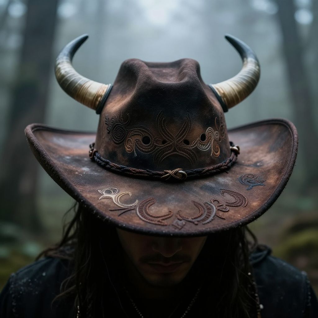 Cowboy hat with horns blending traditional western design with mythical elements, worn by a mysterious figure in a foggy forest, intricate embroidery, dark fantasy vibe