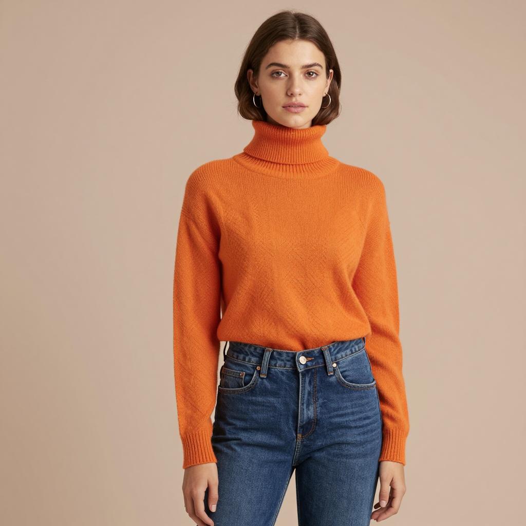 Photograph of a young woman with short, curly brown hair and light brown skin. She has a neutral expression and brown eyes. She wears an off-shoulder, beige, chunky knit sweater that exposes her collarbones and upper chest. She stands against a plain white background. Her sweater is loosely draped, with the right side slightly higher than the left. She looks directly at the camera. Her lips are slightly parted.