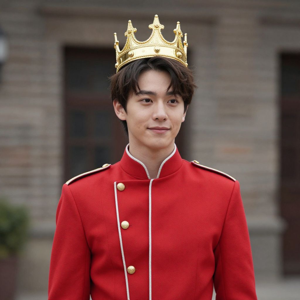 Photograph of a young Asian man with straight black hair, wearing a bright red military-style jacket with white trim and gold buttons. He is adorned with a golden crown with pointed tips, positioned on his head. The background features a blurred, gray stone building with dark windows. The man's expression is neutral, and he stands centered in the frame. The lighting is natural, highlighting the vivid red of his jacket and the golden crown, creating a regal yet modern contrast.