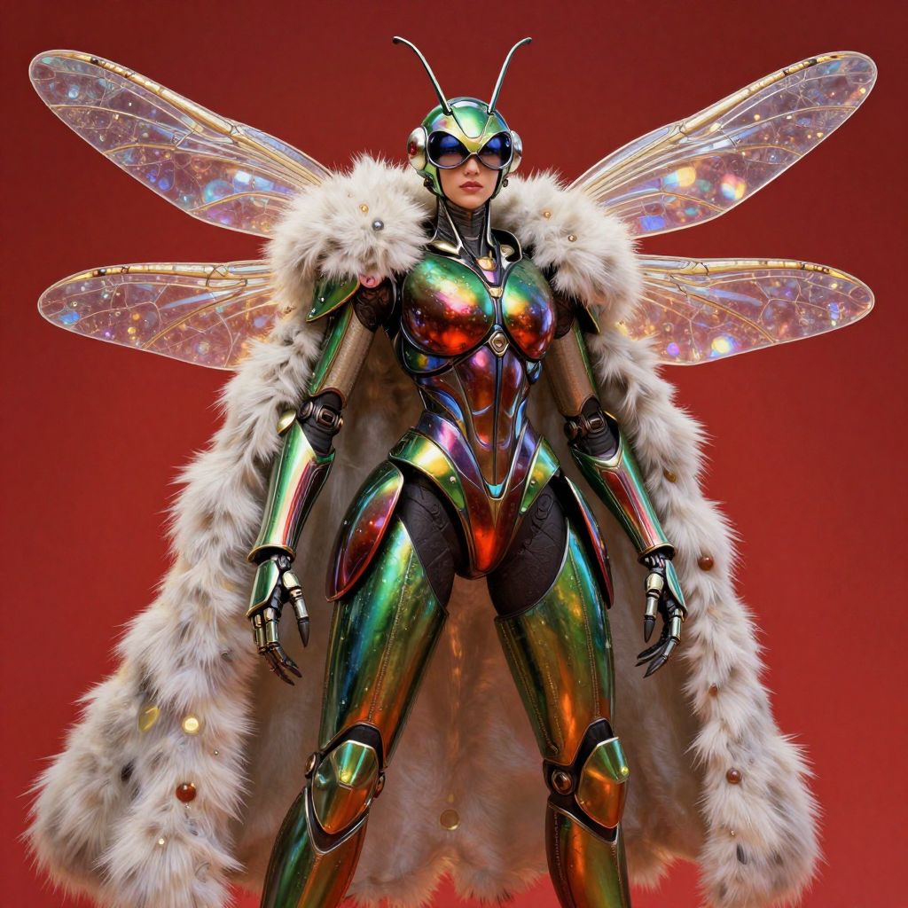 CGI image of a metallic insect-woman with iridescent armor, transparent wings, and a white fur coat, set against a red background.