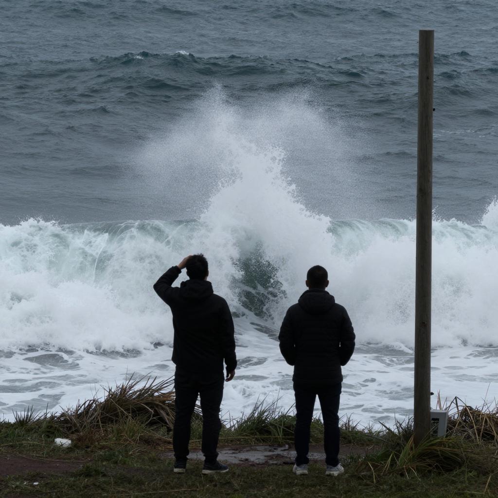 Photograph of two people standing on a grassy coastal cliff, facing a turbulent ocean with powerful white waves crashing. The sea appears rough with blue-gray water and intense ocean spray. A wooden pole is visible on the right side of the image. The individuals are silhouetted by the natural light, wearing dark jackets and casual shoes, observing the dramatic seascape.