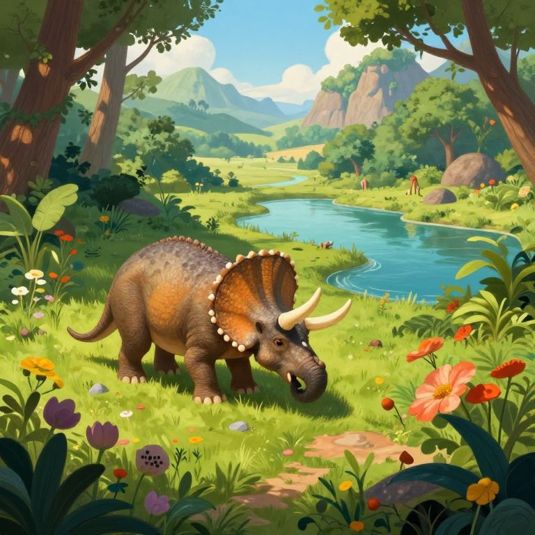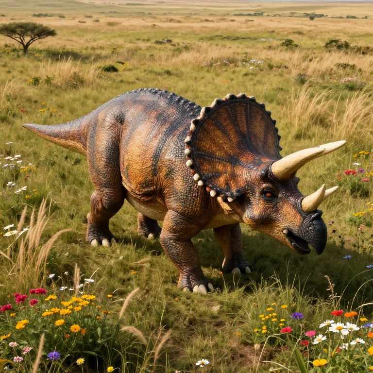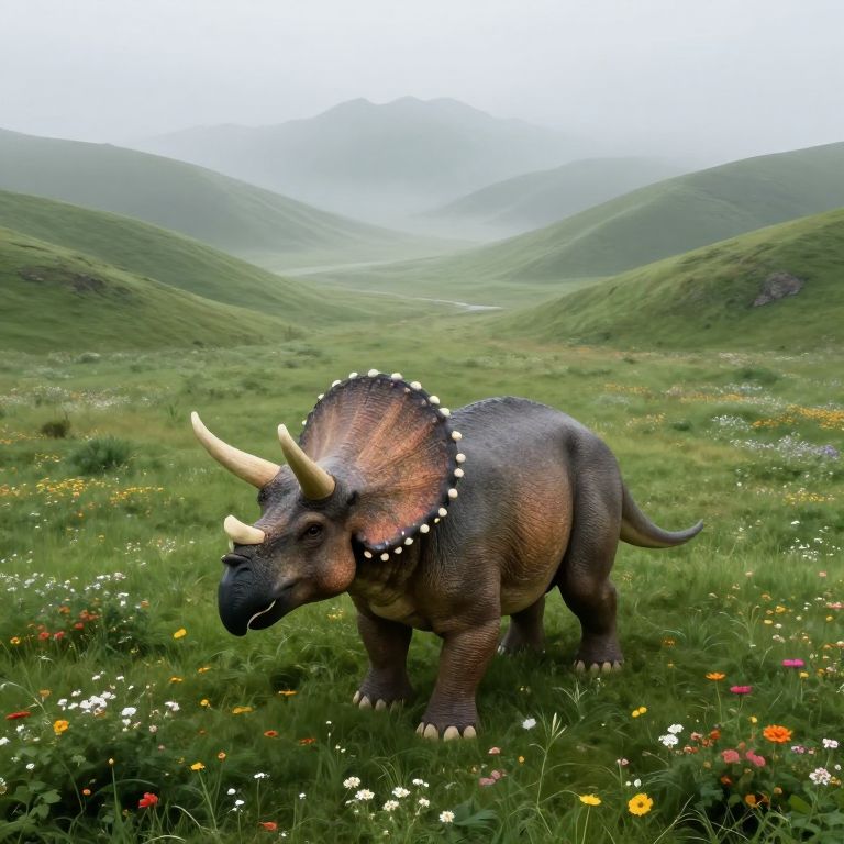 Envision an ethereal, foggy landscape reminiscent of \"Dinosaur Art,\" where a solitary, regal Triceratops proudly stands amidst a lush meadow adorned with colorful blossoms. The scene is captured from a bird's-eye perspective, emphasizing the creature's magnificence against a panorama of undulating green slopes and far-off mountain chains. This tranquil tableau evokes feelings of awe and reminiscence, beckoning viewers to envision the bygone era when these awe-inspiring beings roamed this idyllic terrain.
