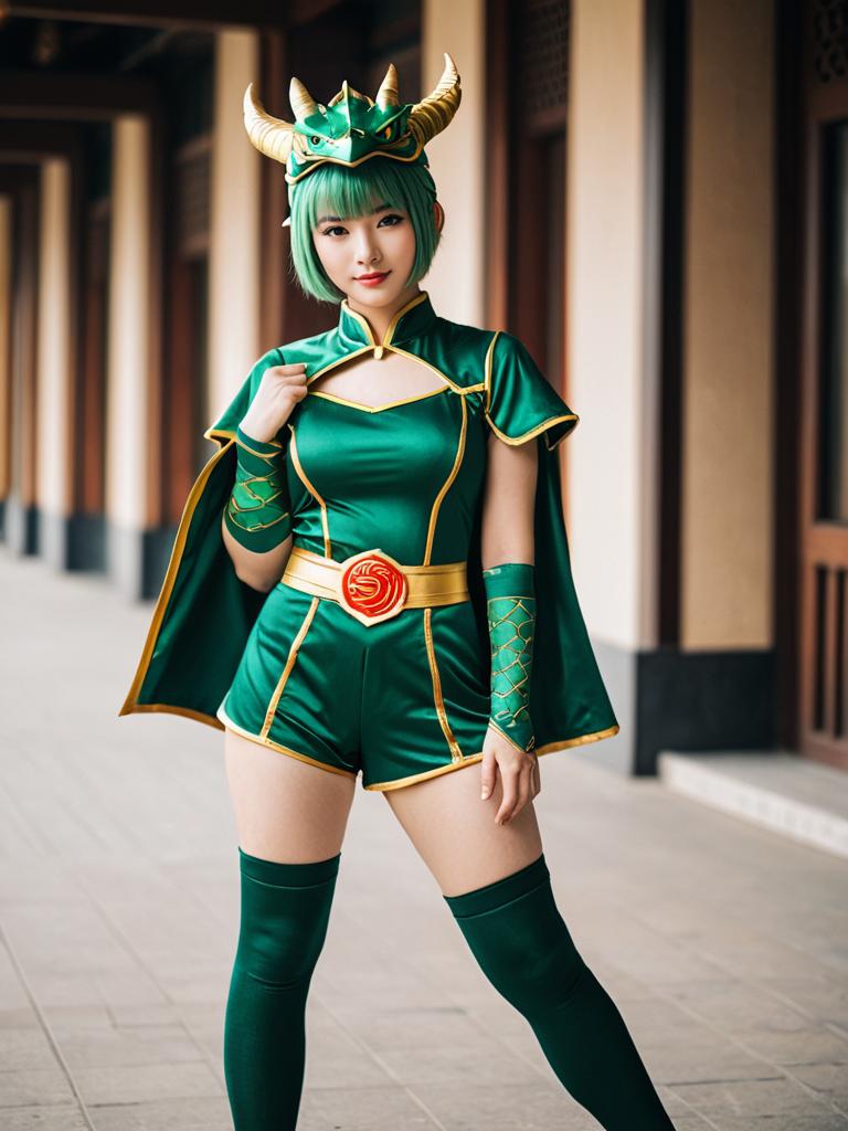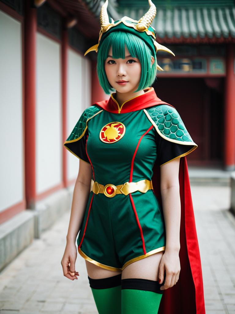 Photo-realistic image of a young woman wearing a green and gold Dragon Kid superhero costume with a red cape, green thigh-high stockings, and a horned hat. The cosplay outfit features Chinese-style design elements and vibrant colors. The subject has green hair and green eyes, standing outdoors in front of traditional architectural elements with a soft blurred background.