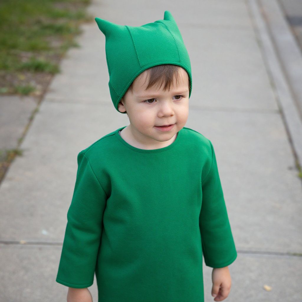 Photograph of a young boy with fair skin, brown hair, wearing a green cat-eared hat and matching green shirt, standing on a sidewalk.