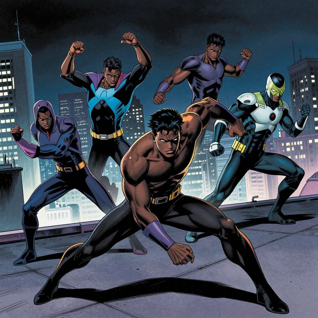 Black cartoon characters as superheroes in action, sleek futuristic costumes with neon accents, intense battle scene on a rooftop at night, dramatic lighting and powerful stances, comic book style with sharp contrasts and dynamic angles.