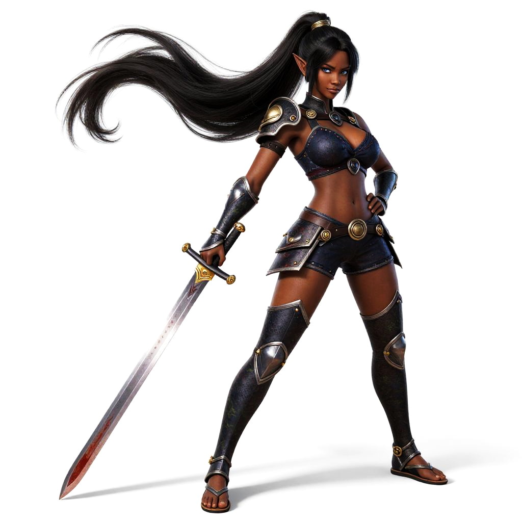 A digital illustration of a dark-skinned, muscular female warrior with long, flowing black hair. She stands confidently, holding a large, blood-stained sword in her right hand. She is dressed in dark, armored attire including a cropped top, short skirt, and arm guards, all adorned with metallic accents. Her pointed elf-like ears and intense gaze add to her fierce appearance. The background is plain white, highlighting her detailed, glossy armor and powerful stance. Her legs are covered in armored thigh guards, and she wears dark sandals. The image is highly detailed, emphasizing her strength and warrior persona.