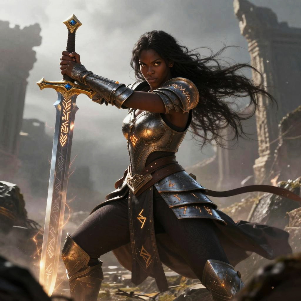 Digital illustration of a muscular, dark-skinned female warrior with long black hair, wearing dark armor and holding a blood-stained sword. She stands confidently