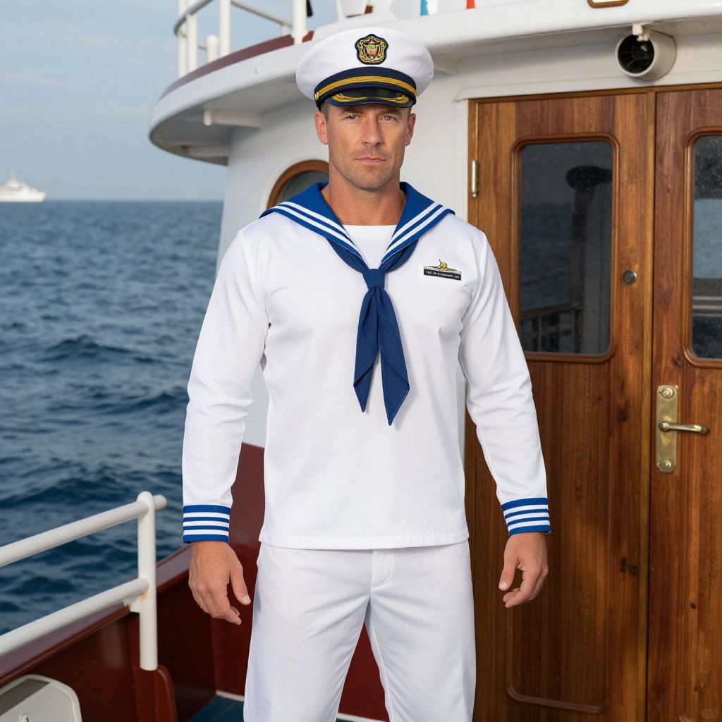 Love Boat Captain Costume, man in a sailor's uniform standing in a boat