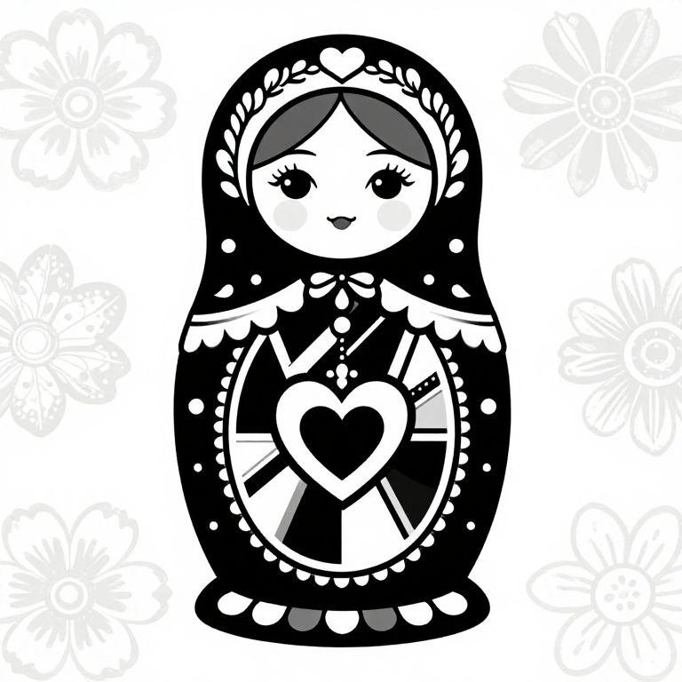 A black and white illustration of a queen of hearts matrioshka doll, adorned with intricate floral patterns and holding a heart-shaped ornament, set against a floral background.