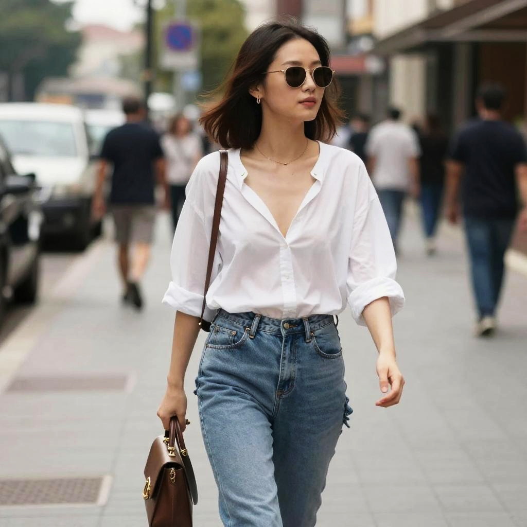 Masterpiece, best quality, 8k, official art, cinematic light, ultra high res, 1girl, sexy, mature, solo, jewelry, earrings, glasses, skirt, long hair, bag, looking at viewer, hoop earrings, sweater, white sweater, brown hair, brown eyes, brown background, jacket, brown skirt, sleeves past wrists, turtleneck, long sleeves, holding, brown jacket, brown nails, handbag