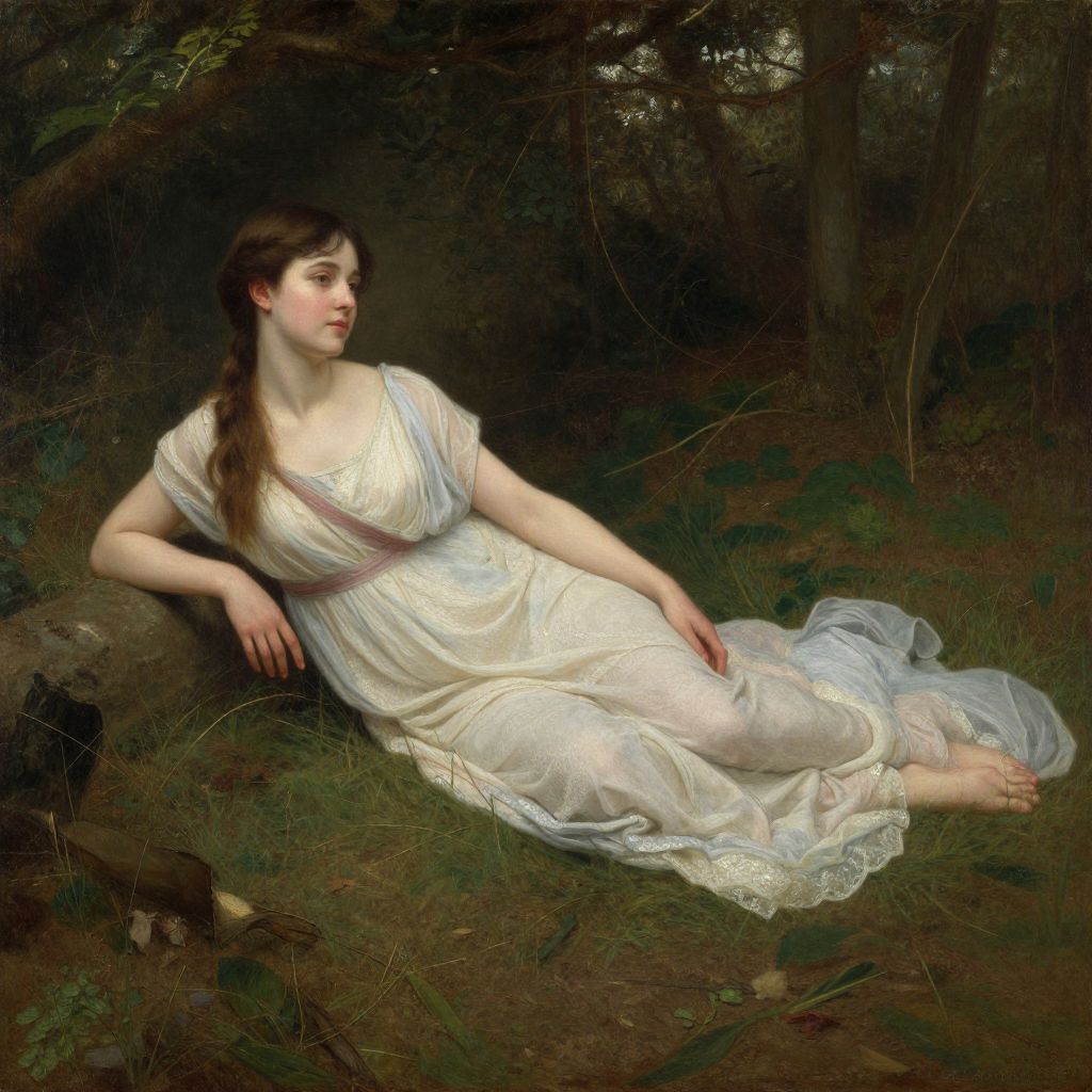 A serene oil painting by Thomas Benjamin Kennington depicts a young woman reclining gracefully on a grassy forest floor, her soft, flowing attire and delicate features rendered with meticulous realism, capturing the tranquil beauty of nature and classical elegance.