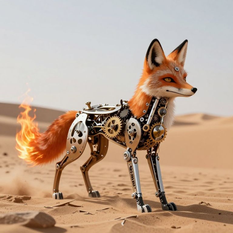 Digital artwork of a robotic fox with gears, metal limbs, and a fiery tail, standing in a sandy desert under a clear sky.