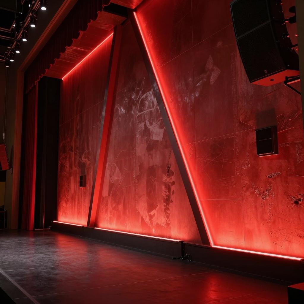 Shoes diagonal back stage wall, behind the stage, concert backstage structure, backstage scene, structures, backstage curtain, theatere backstage, stage equipments on floor, backstage equipment, behind stage, empty movie making scene, making film, wall texture neon, stage set, film set, led lighting, movie sets, wall background, contemporary wall , grunge style, modern wall, fascinating wall, hollywood style wall, high quality, lighting, red light, sound devices on wall, filming devices, shining, hyperrealistic, 8k,