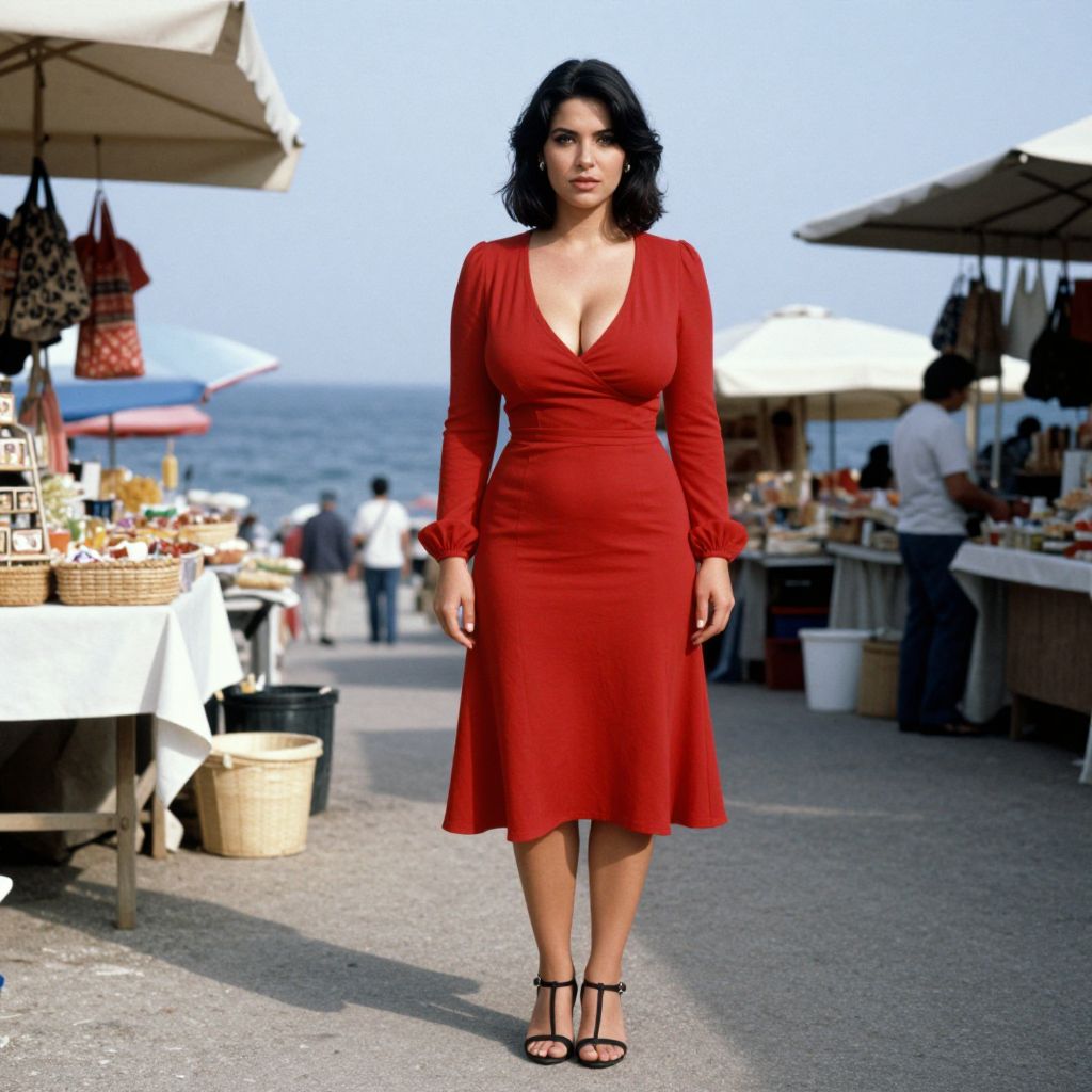 A busty woman in a playful retro square-neck mini dress with a floral pattern in yellow and red, short puff sleeves, and white flat shoes, poses at the Seafront promenade with market vendors. She accessorizes with round sunglasses in light pink frames and white stud earrings. The scene is captured in a technicolor analog film stock style. Sexy. Pretty face and beаutiful eyes. Big breasts