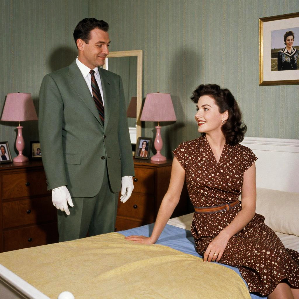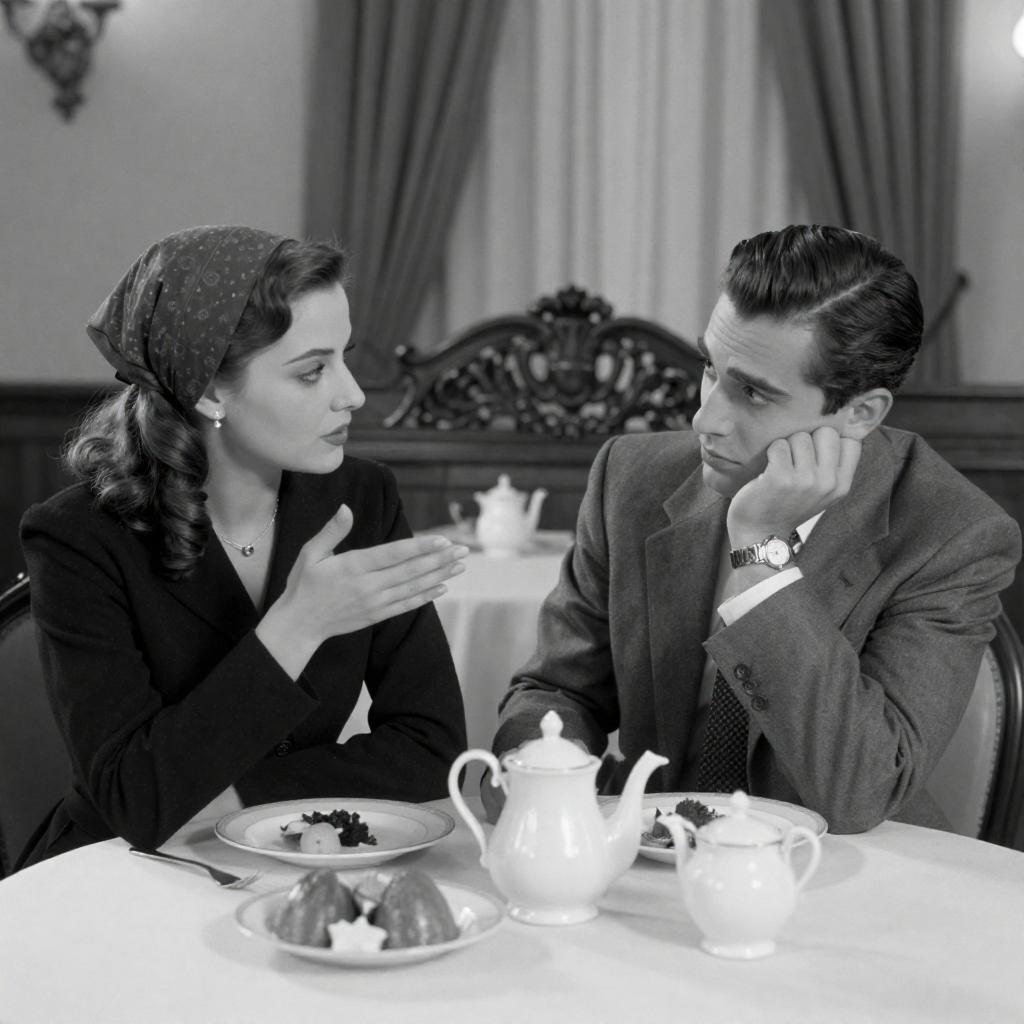 Vintage photograph of a man and woman sitting at a dining table. Woman in red outfit with white accents, red hat, curly brown hair, smiling. Man in dark suit, white shirt, light blue tie, looking at her. Both holding glasses. Table with food, drinks, napkins. Background includes waiters, other diners, green curtains. Woman on left, man on right.