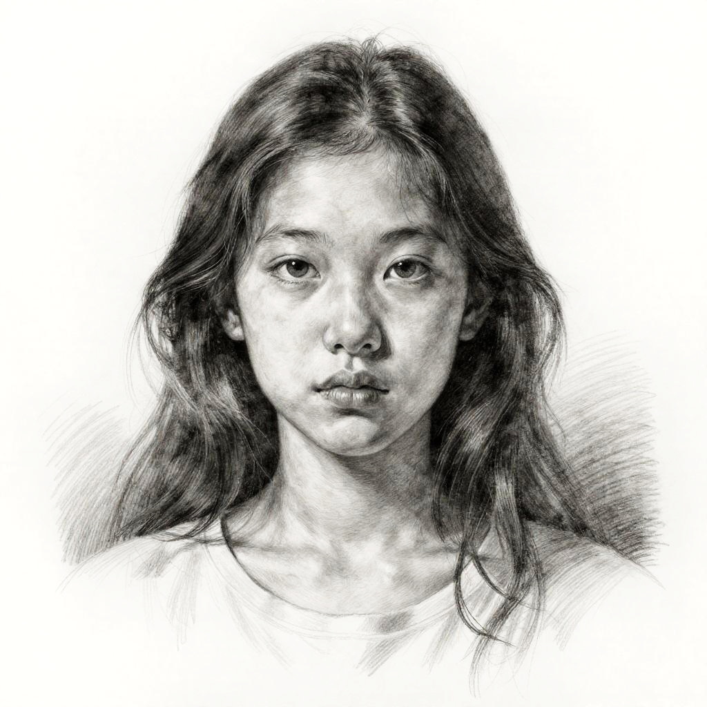 This is a highly detailed, black-and-white, digital pencil drawing of a young woman with long, slightly wavy hair and light skin. She has a contemplative expression, gazing directly at the viewer with large, expressive eyes. Her right hand is gently resting on her cheek, with her fingers slightly curled under her jaw. She wears a simple, casual shirt. The background is entirely white, making her the focal point. The texture of the drawing is rich, with cross-hatching and fine lines that create depth and realism in her features and hair. The overall style is realistic yet slightly stylized, with a focus on capturing her introspective mood.
