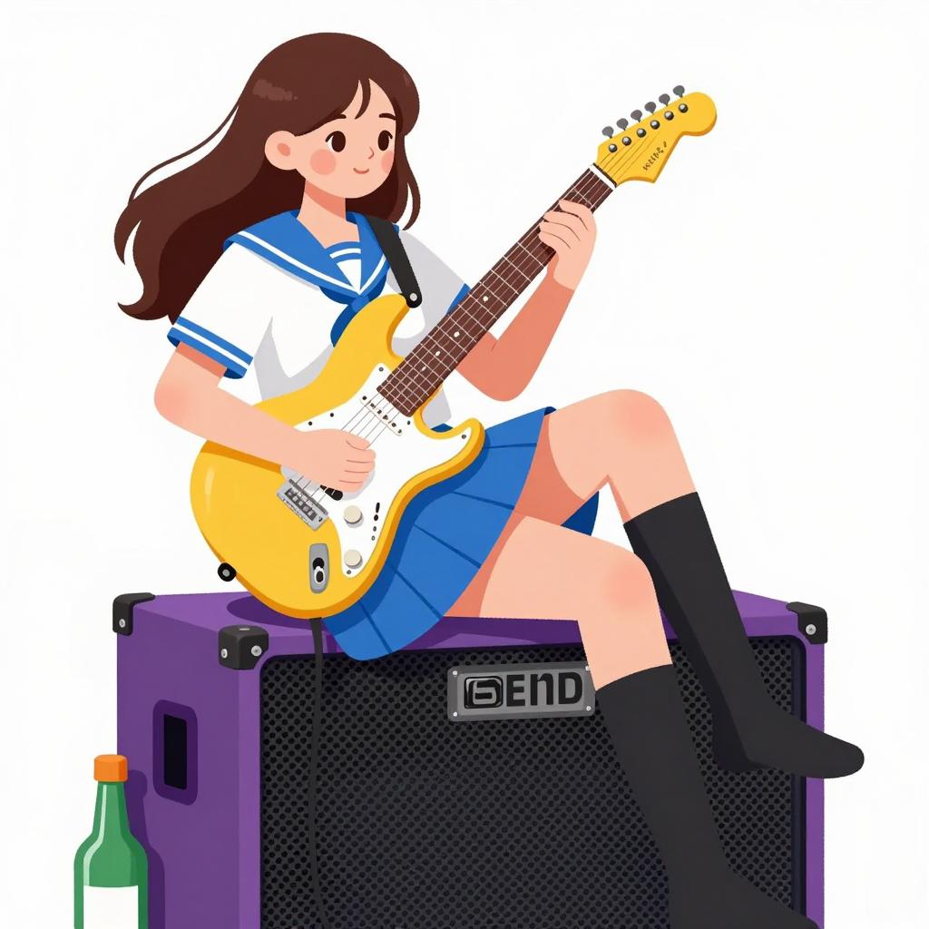 Digital illustration of a girl kneeling, playing an electric guitar. She has long brown hair, wears a white shirt, blue pleated skirt, black knee-high socks, and white sneakers with green accents. Her hands grip the guitar neck and pickstrings. The guitar body is white with a red and green pattern. The guitar is positioned diagonally across her body.