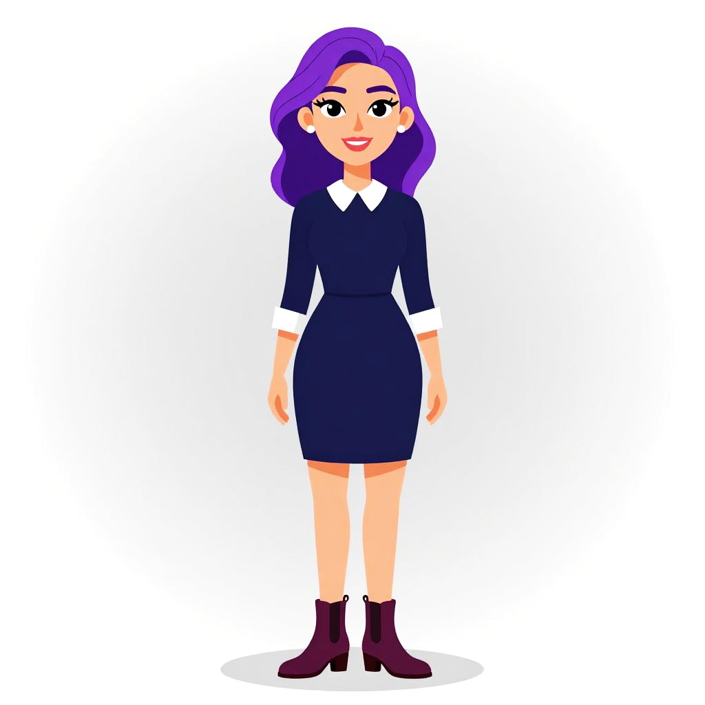 Digital cartoon of a smiling woman with purple hair, wearing a navy dress, white collar, black sleeves, brown ankle boots, and standing against a white