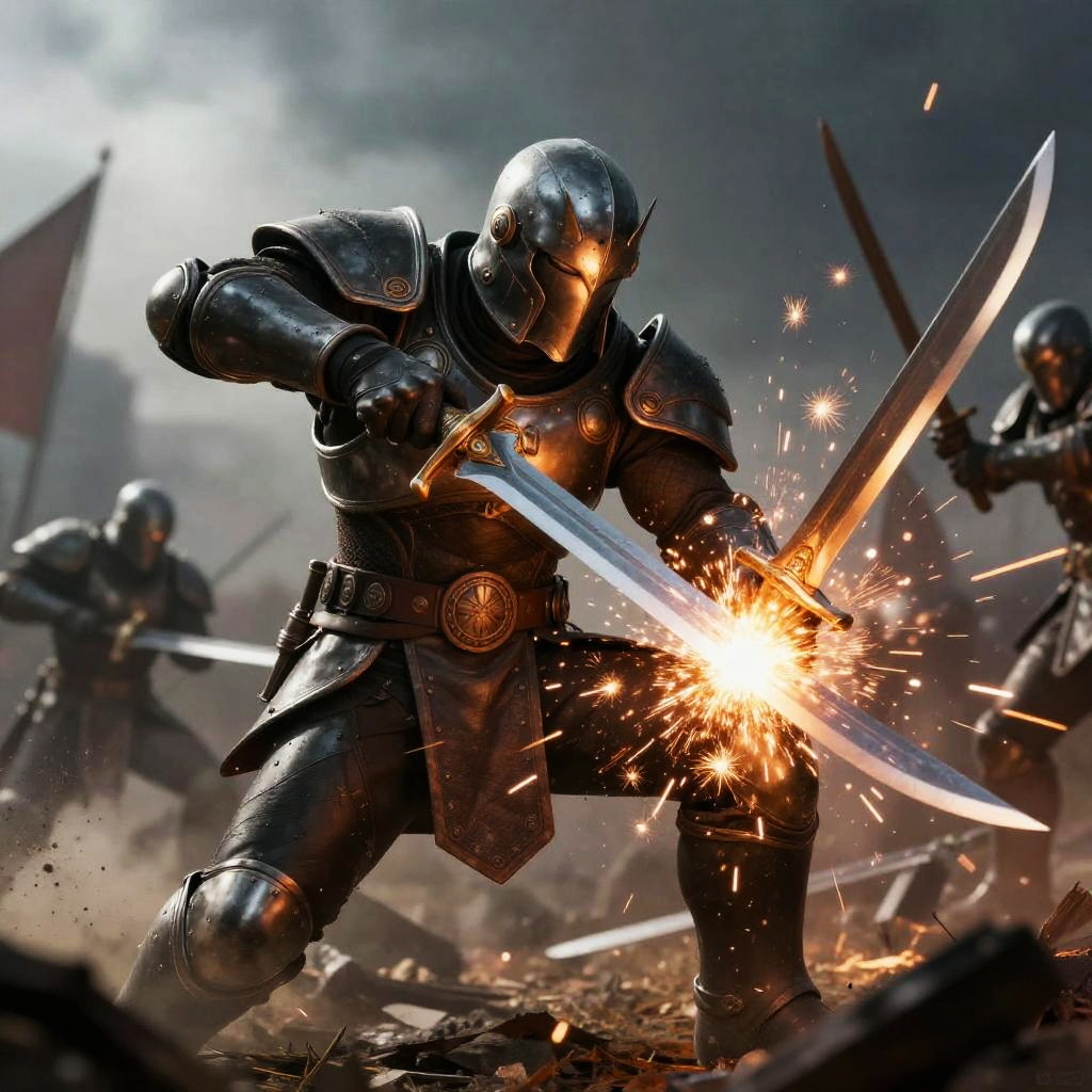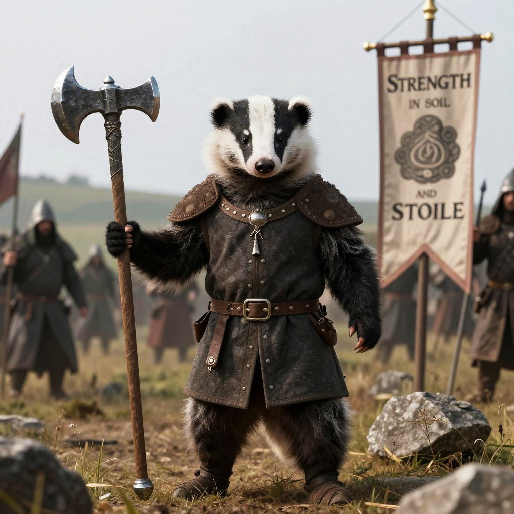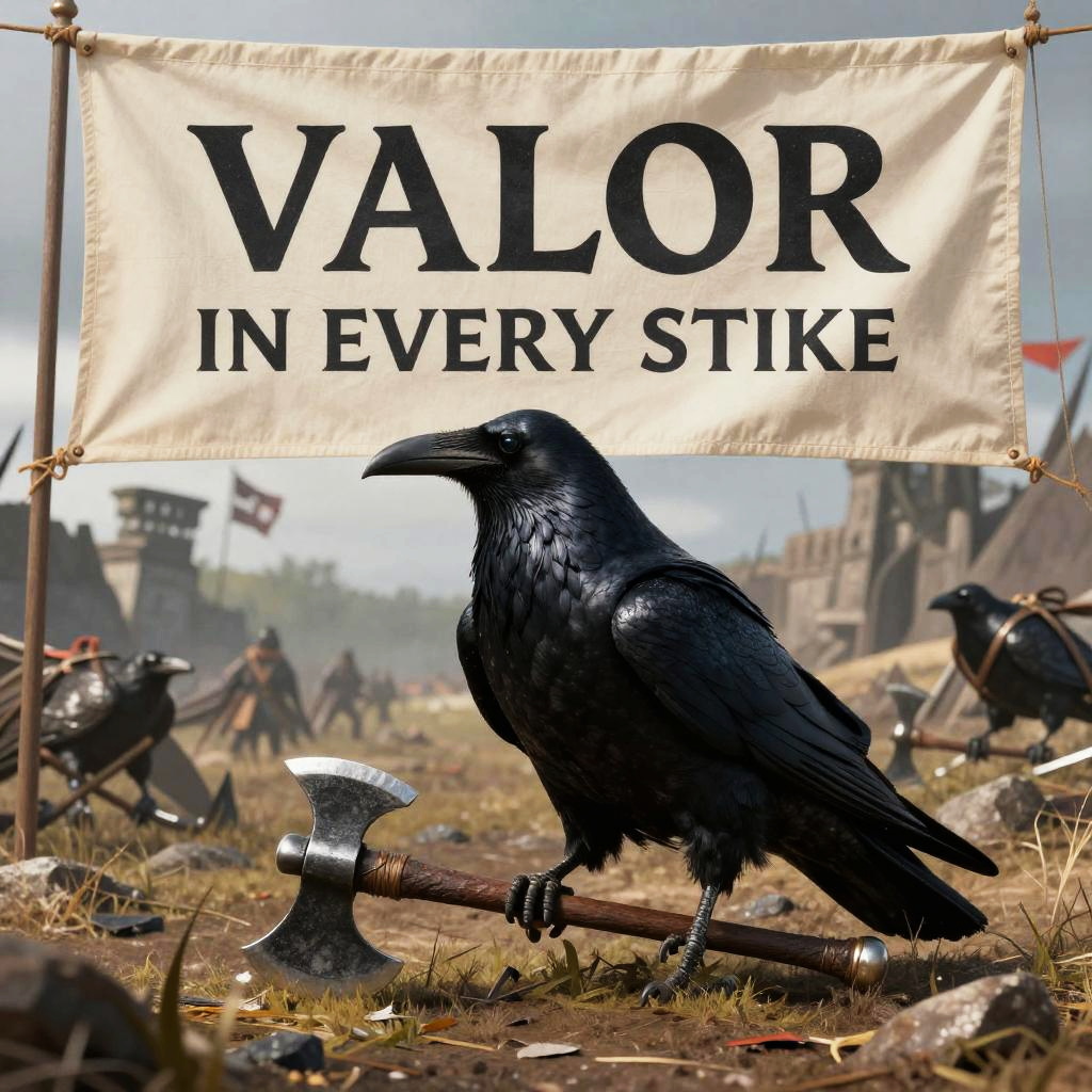 A viking raven with battle axe on a battlefield with a banner that says Valor in every strike.