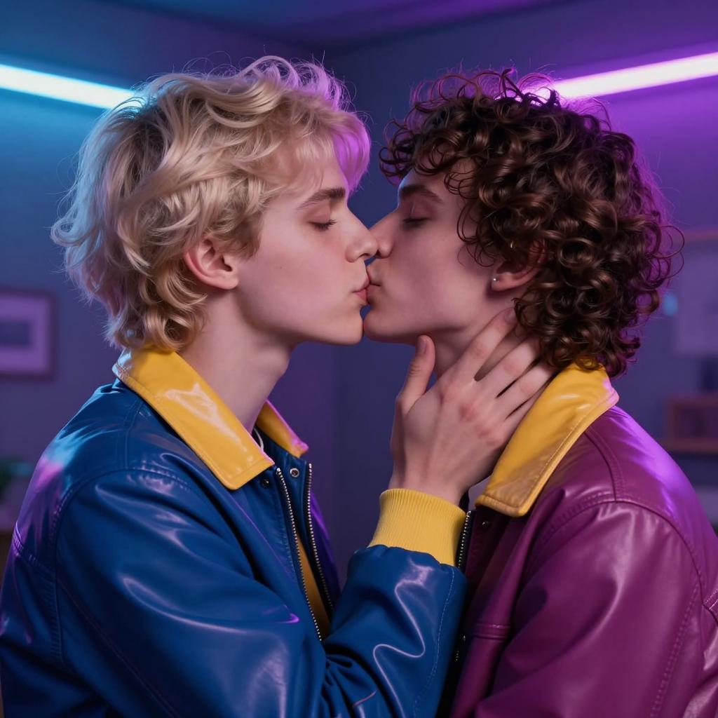 Two people kissing in a dimly lit room with purple and blue neon lights. Both wear shiny, colorful jackets with yellow collars. The person on the left has blonde hair, while the person on the right has curly brown hair. The person on the right's hand rests on the other's cheek. Smoke or mist is in the background. Both eyes are closed.