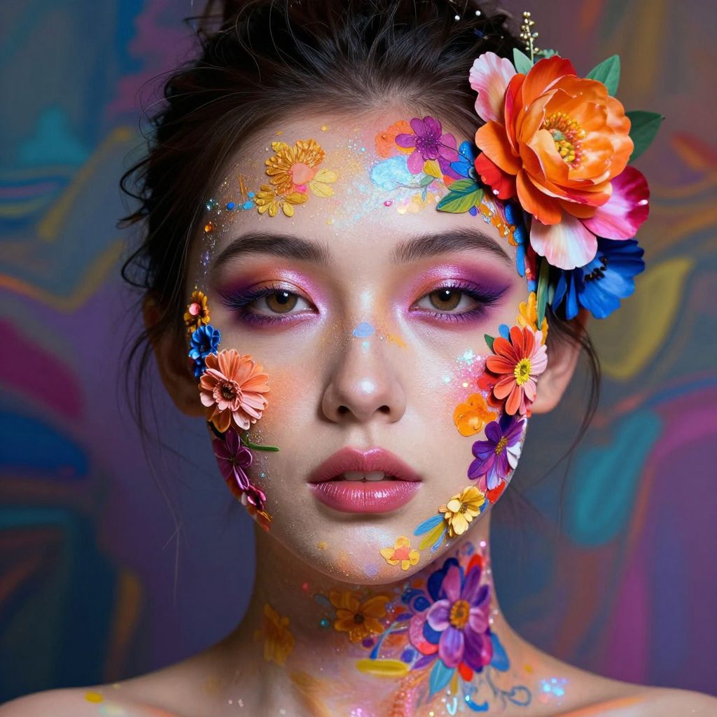Photograph of an Asian woman with fair skin and dark hair in a messy updo. Her face is adorned with vibrant, colorful floral patterns in orange, red, blue, purple, and yellow, resembling a face paint design. Her eyes have striking purple eyeshadow, and her lips are a natural pink. A large orange flower with green leaves is positioned on the right side of her head. The background is a blurred, psychedelic mix of blue, purple, and yellow swirls. The overall style is vivid and surreal, emphasizing bright colors and intricate floral patterns.