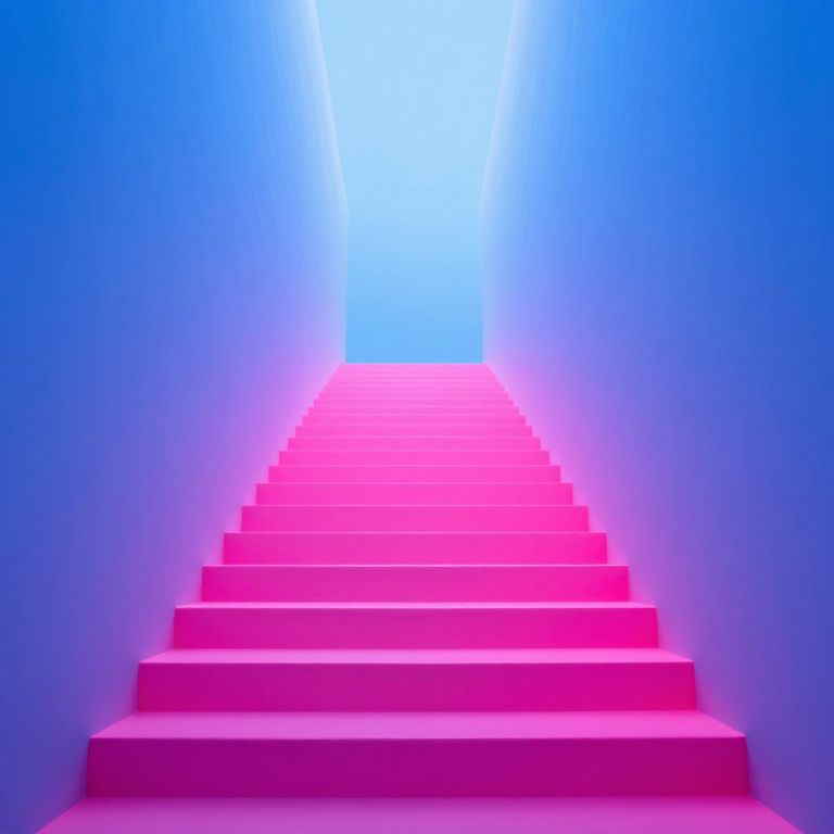 A luminous staircase bathed in vibrant pink neon ascends into an ethereal blue void, defying gravity and perspective in a mesmerizing journey toward an unseen horizon.
