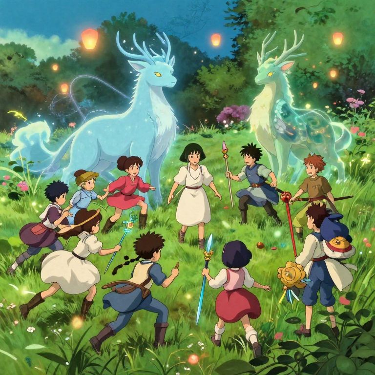 Studio Ghibli DnD magical battle in a serene meadow with ethereal spirits and mythical beasts, characters wielding enchanted weapons, lively anime-inspired environment with rich flora and floating lanterns, dynamic action poses, dreamy and detailed background with subtle glowing effects.