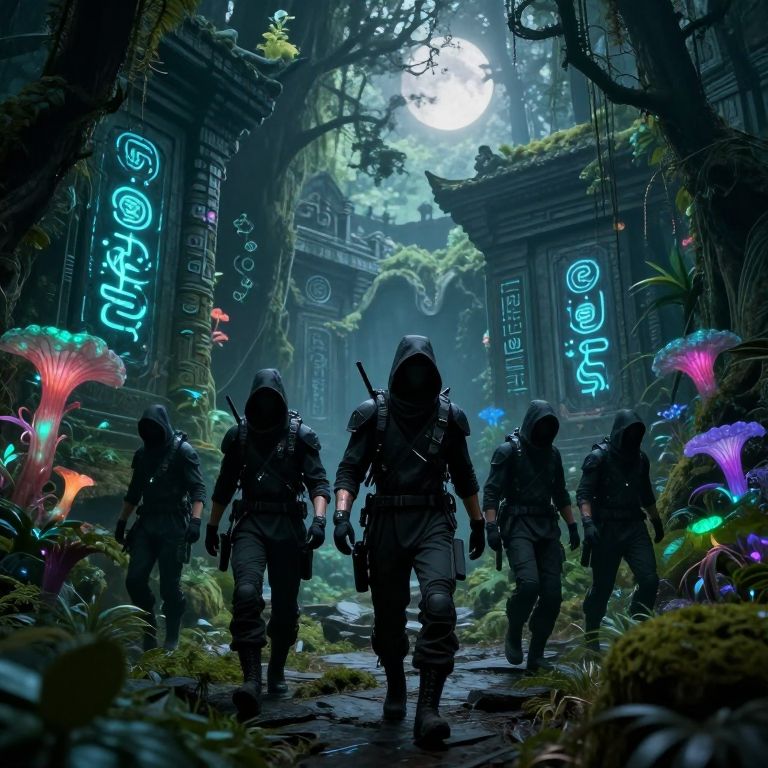 A skuat of agile cyber ninjas in stealth gear moving through an ancient temple overgrown with bioluminescent plants, mysterious glowing symbols on walls, moonlight filtering through trees, a blend of traditional and high-tech elements in a mystical forest.