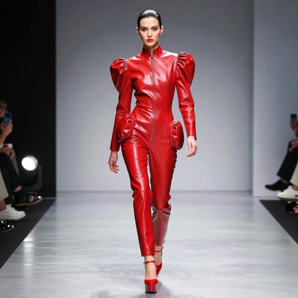 A photograph of a model in a sleek, futuristic runway show. She's wearing a shiny, red latex jumpsuit with puffed shoulders and exaggerated, bubble-like pockets on the sides. Her hair is slicked back, and she's walking confidently in red platform heels. The background is minimalist with a gradient from dark to light gray, and a bright light source on the left.