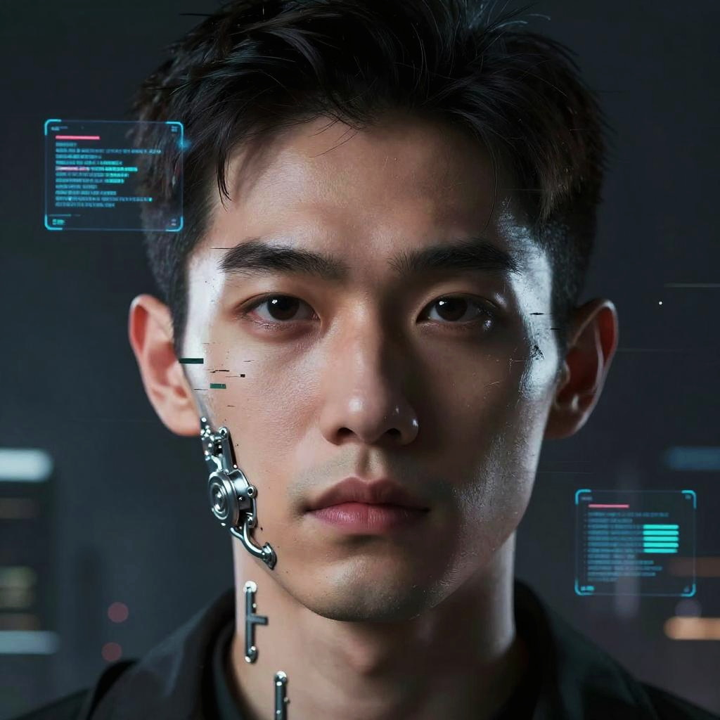 Edit face by incorporating glitch art elements, fractured pixels and distorted facial features, combined with a dark moody color palette, highlighting cybernetic implants and holographic displays, set against a dystopian digital landscape.