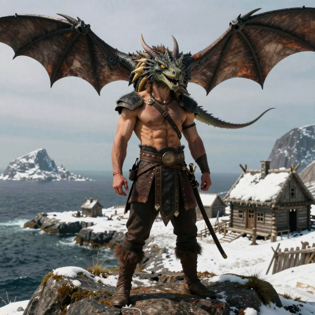 ([by Bebebebe, by Darkgem, by Jiandou:by Anthony van Dyck, by Taran Fiddler, by Annibale Carracci, by Chumbasket:0.35]), solo muscular male (((rathalos, flying wyvern), yellow eyes)), (standing, three-quarter view, three-quarter portrait:1.25), (berserker clothing), , (norse mythology, viking village:1.25), (island, ocean, snow, wooden house), masterpiece, best quality, ultra realistic, 4k, 2k, (intricate:0.9), (high detail:1.25), film photography, soft focus, RAW photo, photorealistic, analog style, subsurface scattering, photorealism, absurd res