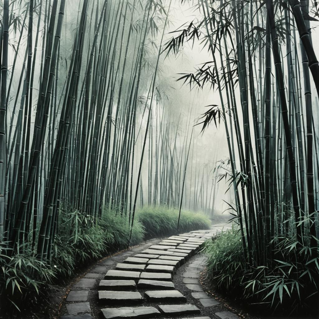 A peaceful misty bamboo grove in the early morning featuring tall bamboo stalks with delicate dew drops. The scene includes a winding stone path through dense bamboo and lush greenery, depicted in a minimalist ink wash painting style with gentle, diffused lighting.