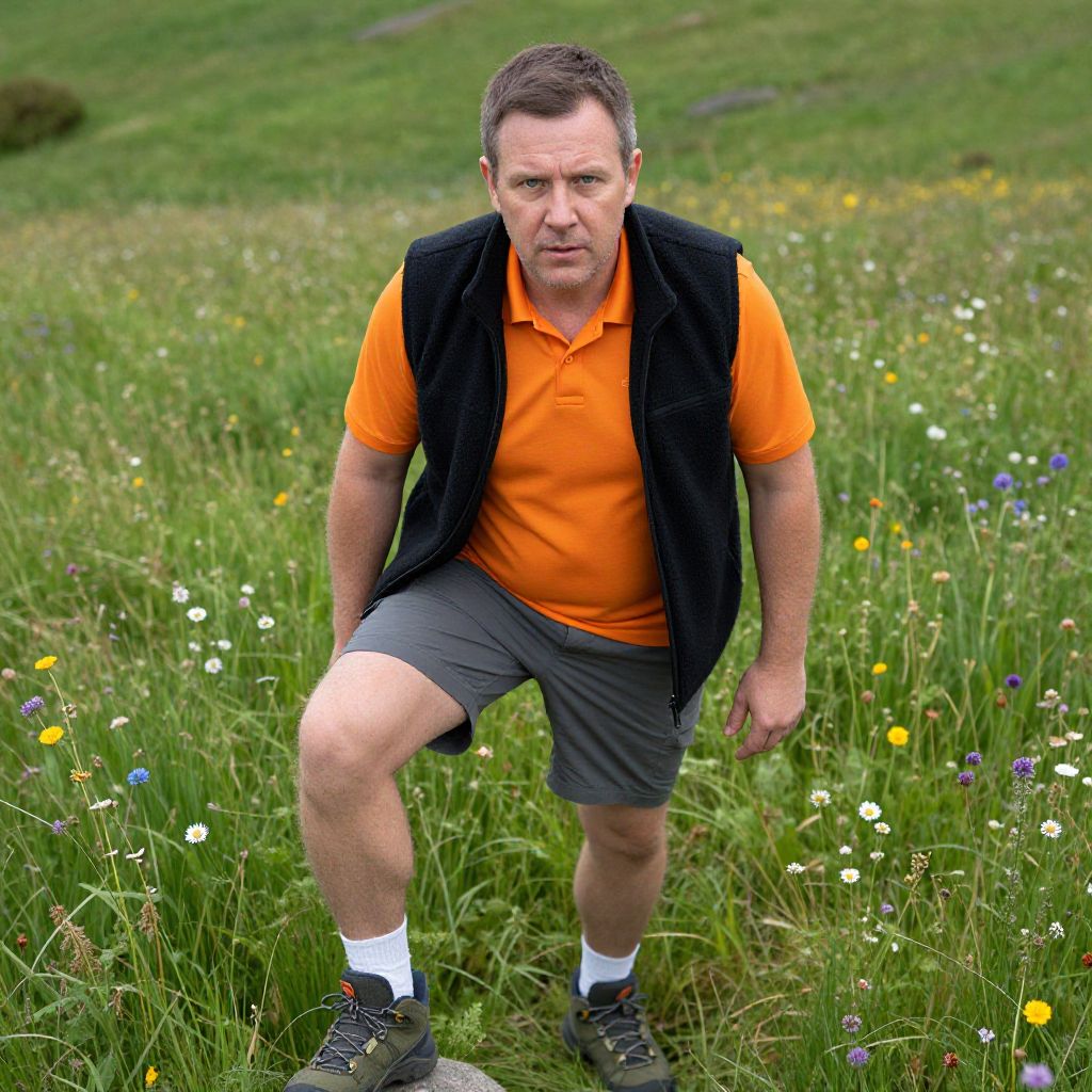 Middle-aged man in orange polo, black vest, gray shorts, white socks, black shoes, standing in lush, colorful meadow, mid-stride
