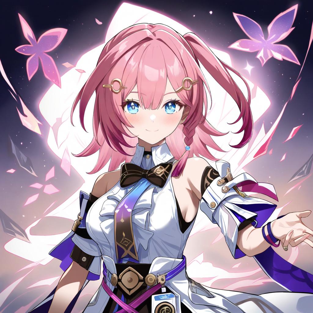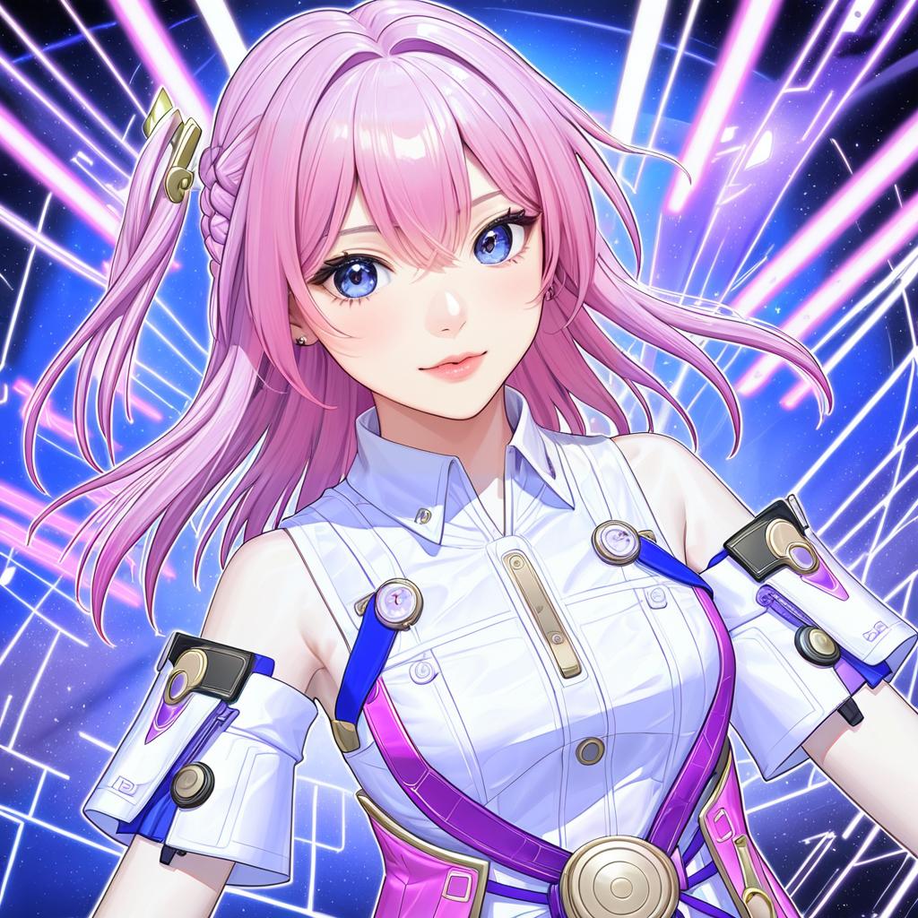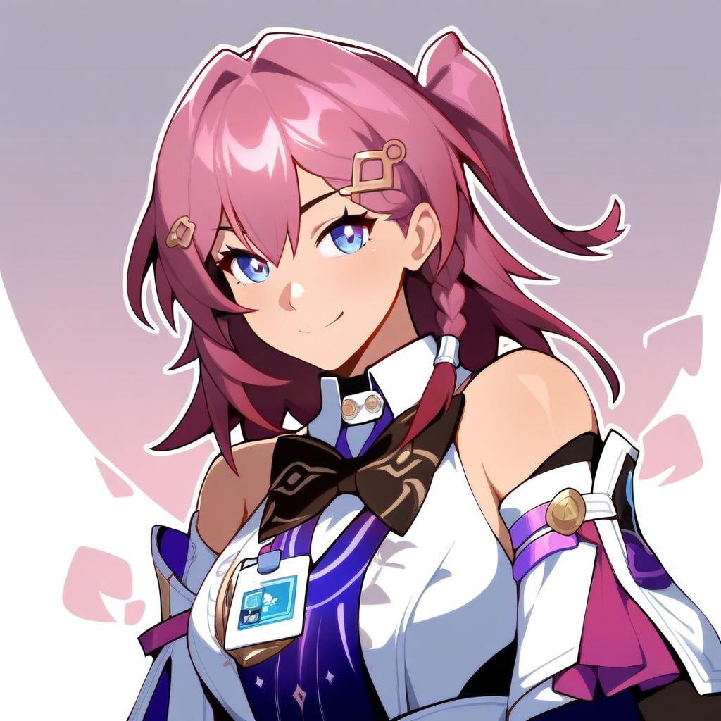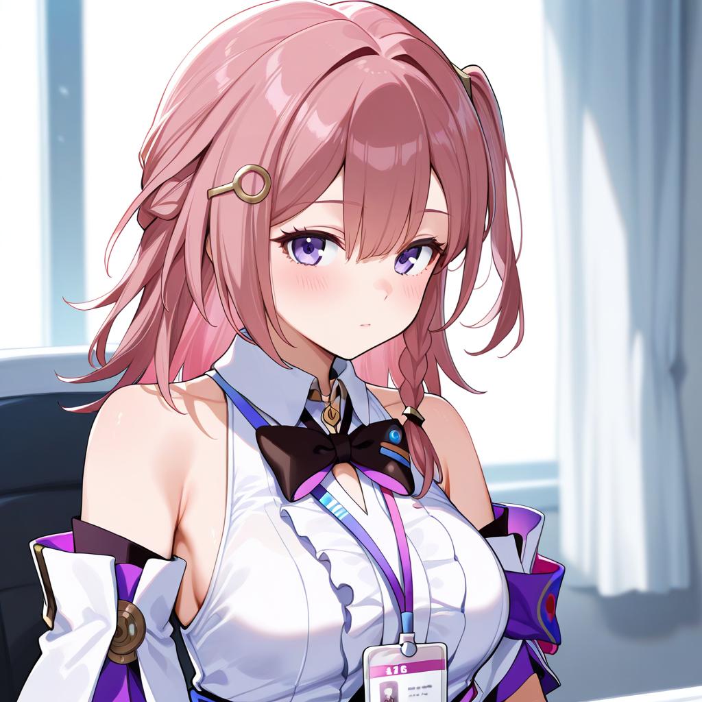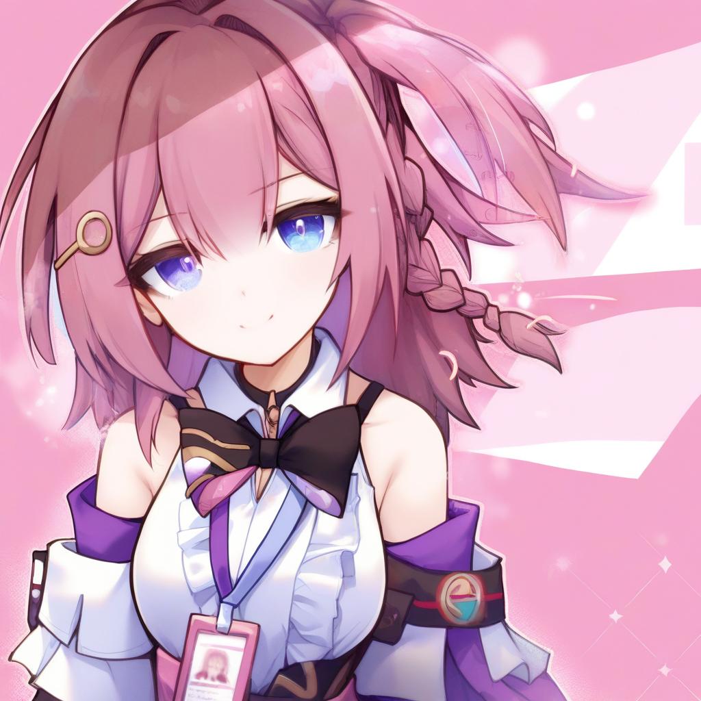 Asta (honkai: star rail), honkai: star rail, 1girl, blue eyes, hair between eyes, pink hair, medium hair, long hair, braid, hair ornament, hairclip, medium breasts, white shirt, sleeveless shirt, bare shoulders, detached sleeves, one side up, id card, by artist tyone, animagine