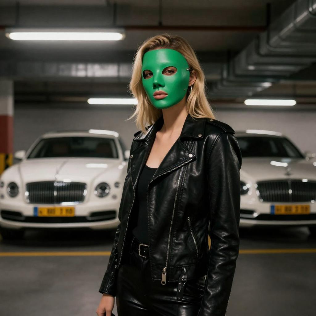 Woman with green mask, blonde hair, wearing shiny black leather jacket, standing in dimly lit underground garage. Two white luxury cars in background, yellow license plates, industrial lighting, metal pipes. Mask expression neutral. Woman's posture confident.