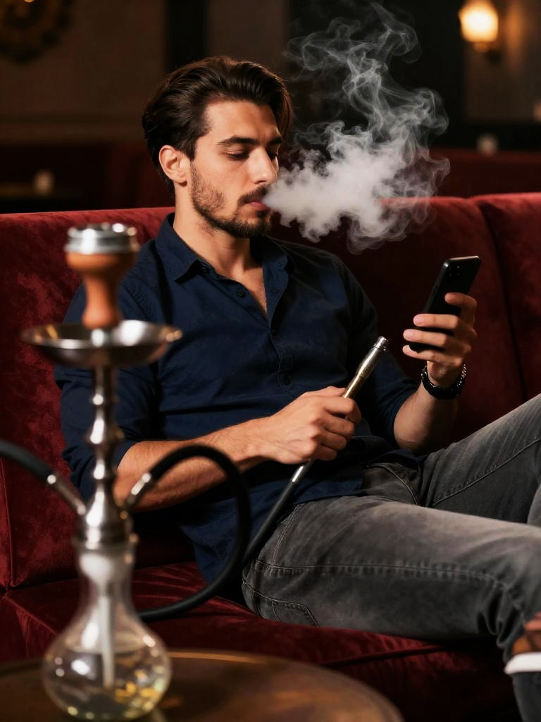 Man smoking shisha, relaxed adult man sitting on a plush sofa in a lounge, light-skinned man with neatly trimmed stubble and side-part hair wearing navy button-down shirt with rolled sleeves and grey jeans, holding the shisha hose in one hand while looking at his phone in the other, dense cloud of smoke drifting from his mouth, ornate hookah with glass base placed on a low table in the foreground, rich warm lighting, deep red upholstery, cinematic lifestyle photo, realistic, high resolution