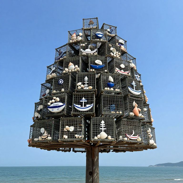 An extraordinary fusion of coastal charm and creative ingenuity, this towering tree of lobster cages, adorned with seashells and nautical flair, stands as a testament to community spirit and the enduring allure of seaside traditions, evoking a sense of wonder and connection to the ocean's rhythm.