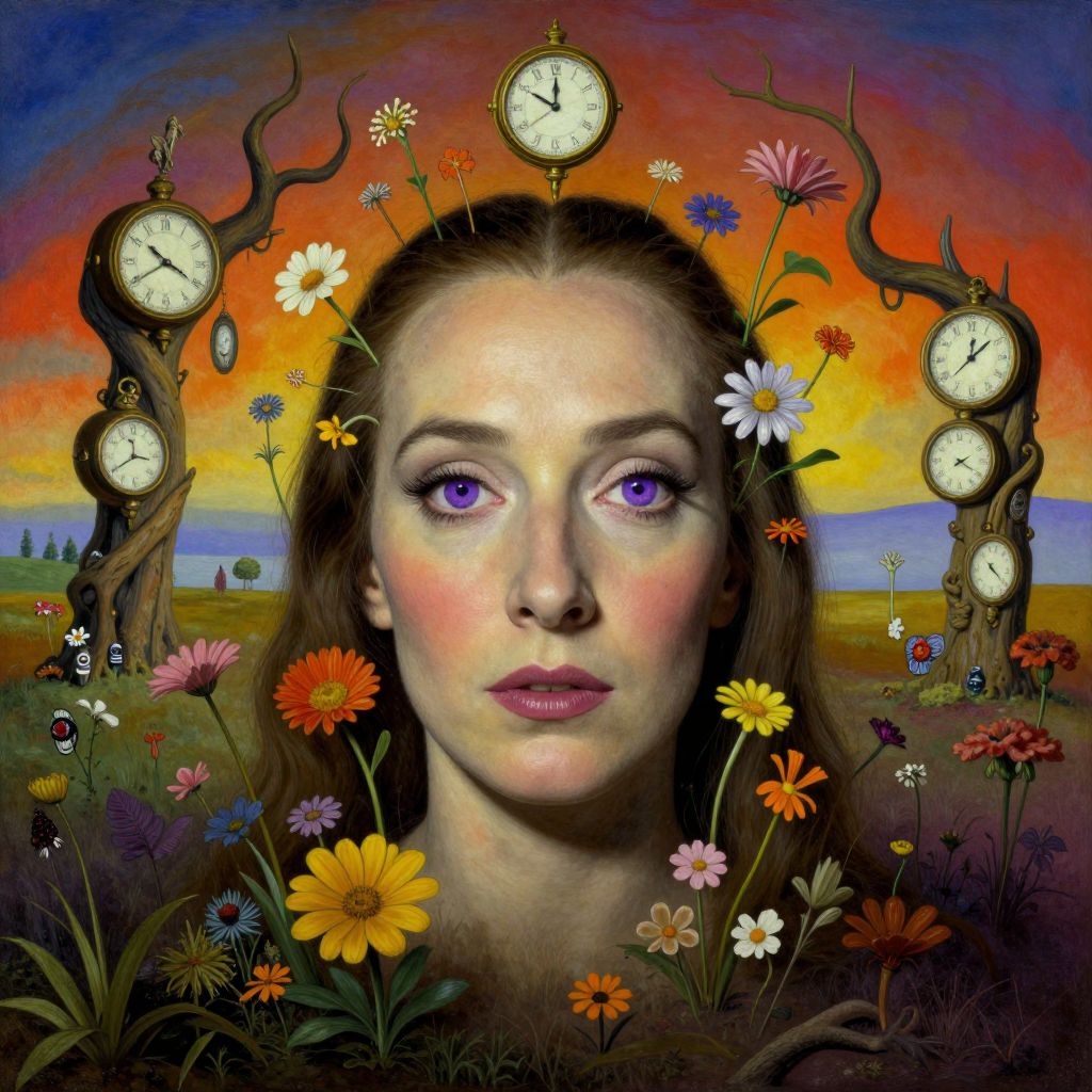 Craft an image in a surreal style reminiscent of Magritte's thought-provoking works, featuring a detailed close-up portrait of a woman with captivating eyes, her face partially concealed by a luminous, translucent mask resembling chameleon skin. The scene transitions to an aerial perspective, as if seen through the creature's own gaze, unveiling a fantastical landscape where human visages form the clouds above and the ground below is littered with scattered timepieces, symbolizing the ephemeral nature of moments. This evocative visual narrative delves into themes of deception, perception, and the blurred boundaries between reality and illusion.